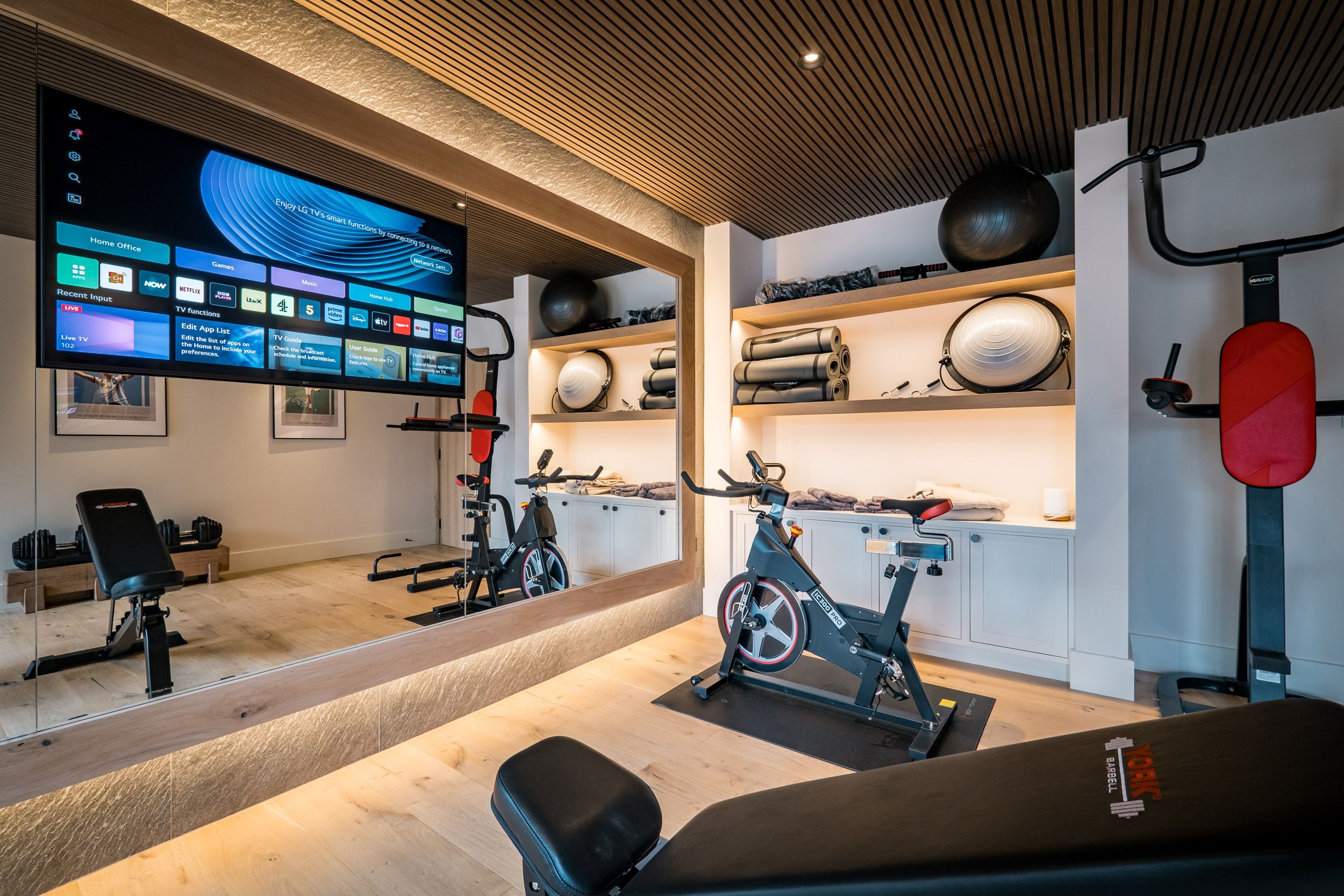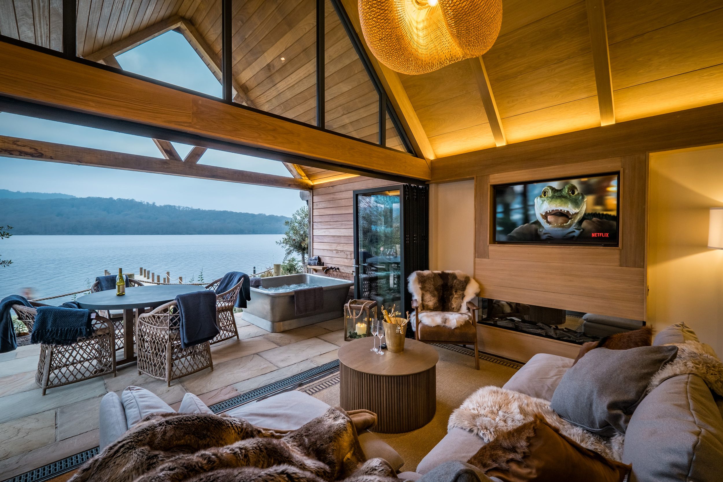 Lakefront. Three-storey. Six bedrooms. 1 x super-king-size (zip/link can be twin on request) with Smart TV, balcony, double en-suite walk-in shower, double basin, heated towel rail, Freestanding bathub and WC. 1 x super-king-size (zip/link can be twin on request) with Smart TV, balcony and en-suite walk-in shower, basin, heated towel rail, and WC. 1 x super-king-size (zip/link can be twin on request) with Smart TV, Juliet balcony and en-suite walk-in shower, double basin, heated towel rail, freestanding bathtub and WC. 1 x second-floor super-king-size (zip/link can be twin on request) with Smart TV, balcony and en-suite walk-in shower, basin, and WC. 1 x second-floor super-king-size with Smart TV, balcony, and en-suite walk-in shower, basin, and WC. 1 x second-floor super-king-size (zip/link can be twin on request) with Smart TV, balcony, and en-suite walk-in shower, basin, and WC. Extra accommodation on sofa beds. Kitchen. Utility. Dining room. Sitting room with woodburning stove. Vaulted gentleman's games room. Ground-floor wood-clad cinema room with surround sound. Gym. Boathouse with spa bath, changing room, shower, and bathroom with freestanding bath, spa bath, basin, and WC, and heated outdoor shower. Note: This property can only accept bookings that start either on a Monday or on a Friday
