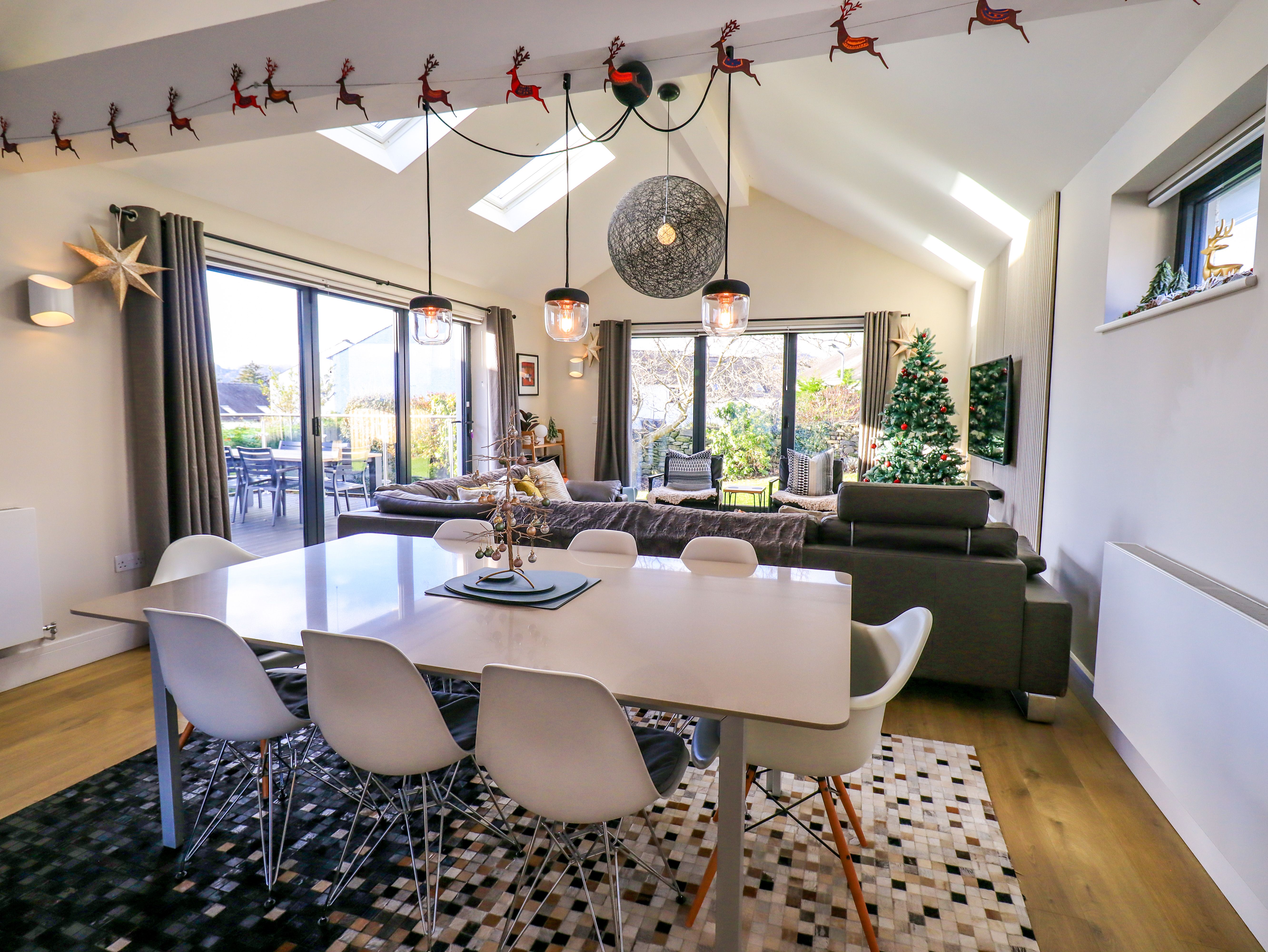 Accomodation Details Single-storey. Four bedrooms: 1 x king-size with en-suite walk-in shower, basin, heated towel rail and WC, 1 x king-size with Smart TV, 1 x king-size, 1 x double. Bathroom with bath and hand-held shower, walk-in shower, basin, heated towel rail and WC. Cloakroom with basin and WC. Open-plan living space with kitchen, dining area and sitting area