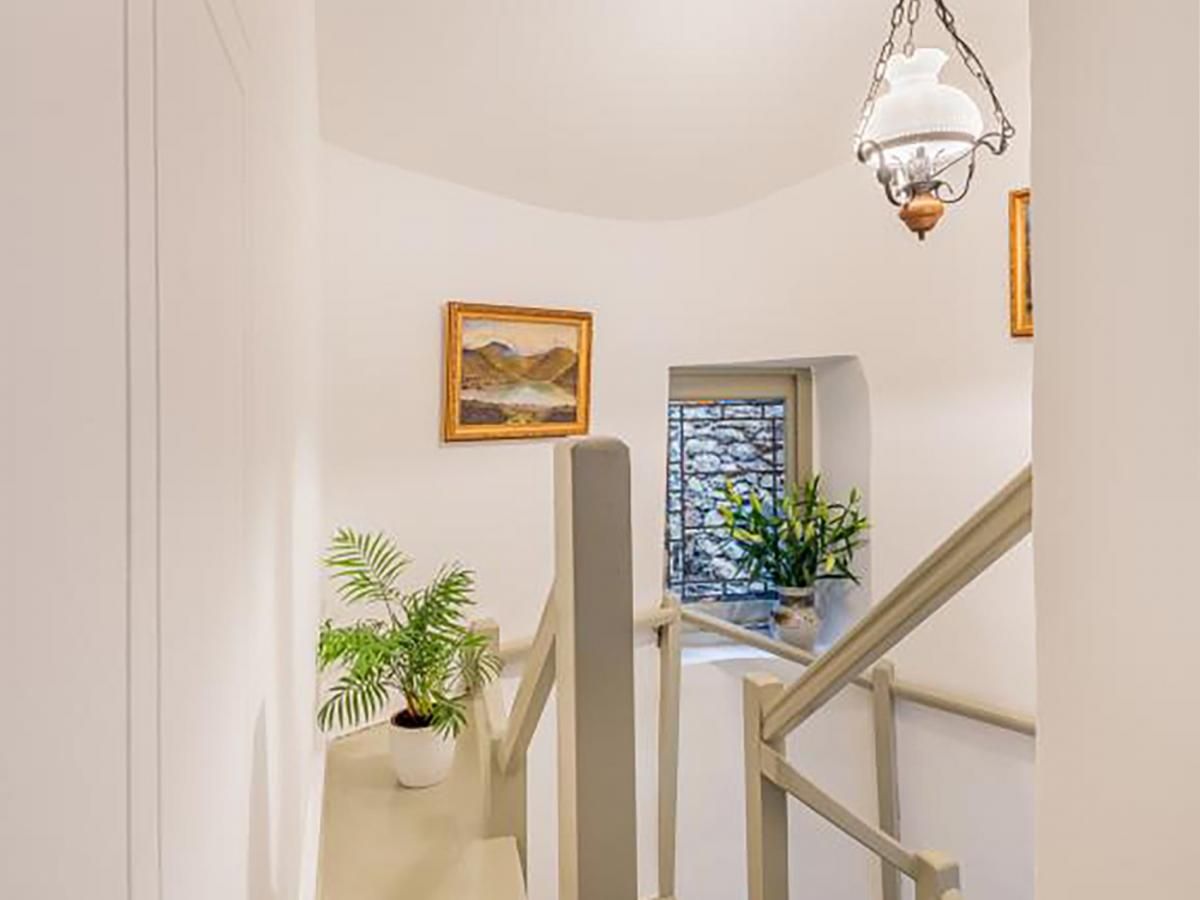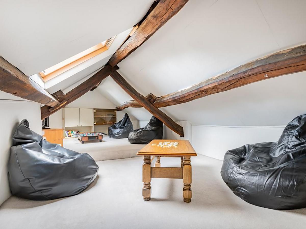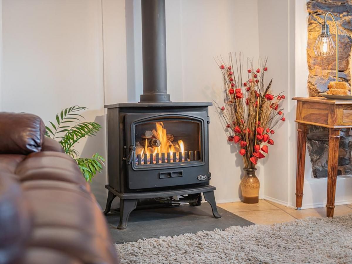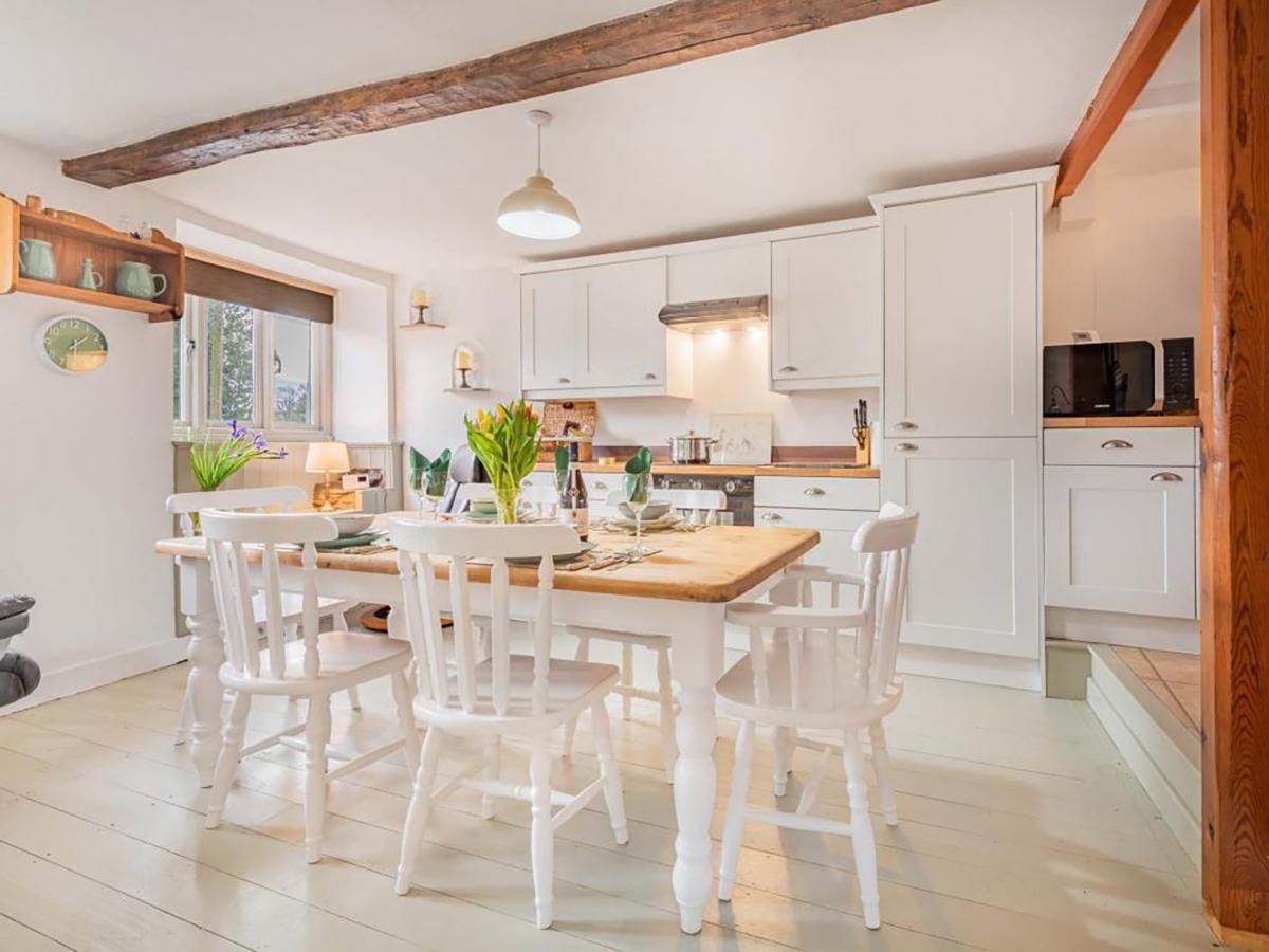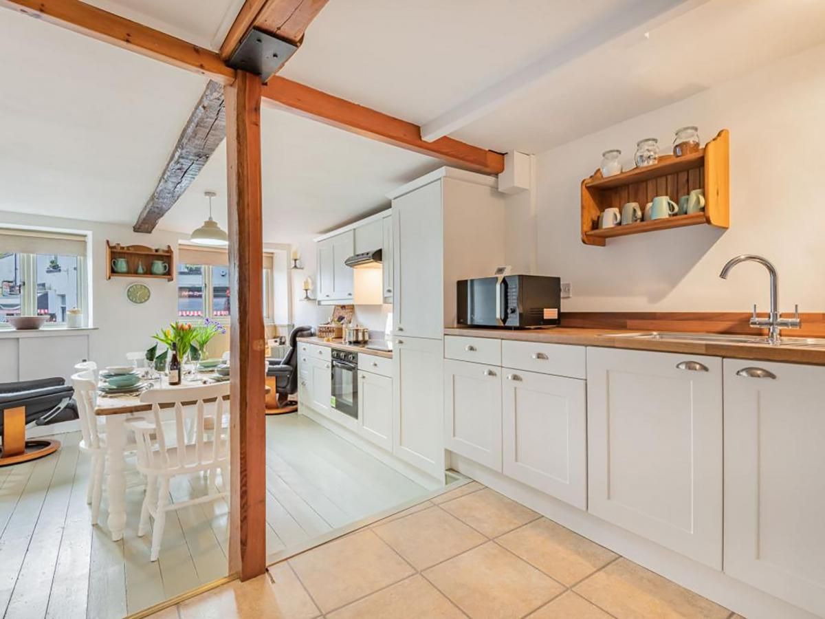 Through the front door is the cosy living room with original beams and a feature gas stove in the impressive fireplace. The bright dining kitchen is well equipped and there's a useful utility area with a handy WC.