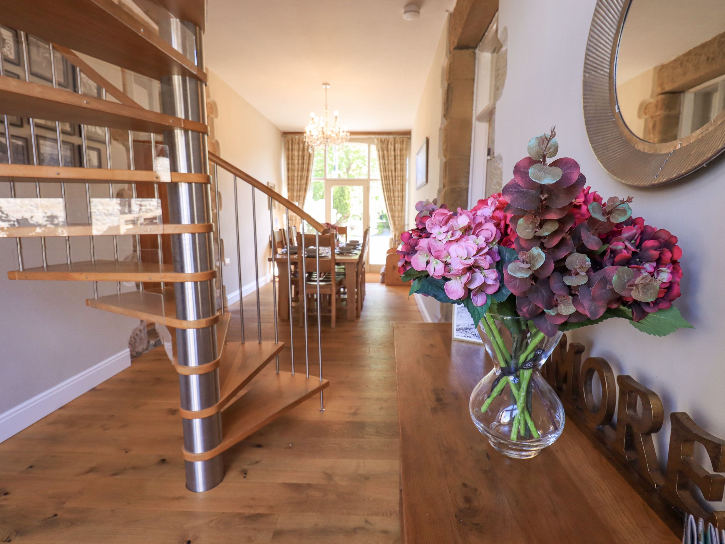 Amenities Gas central heating with woodburning stove. 2 x electric Slide and Hide ovens, induction hob, microwave, American-style fridge/freezer, washing machine, tumble dryer, and dishwasher. Smart TV and WiFi. Fuel, power, and starter pack for woodburning stove inc. in rent. Bed linen and towels inc. in rent. Highchair provided but no travel cot. Mezzanine with beanbags. Off-road parking for 4 cars. Garden with private lawned area and patio with furniture and hot tub. No smoking. Shop 1/2 mile, pub 0.8 miles. Note: Due to the spiral staircase and Velux windows on the second floor, children must be supervised. Note: This property is a Grade II listed. Note: Check-in from 4pm and check-out by 10am.