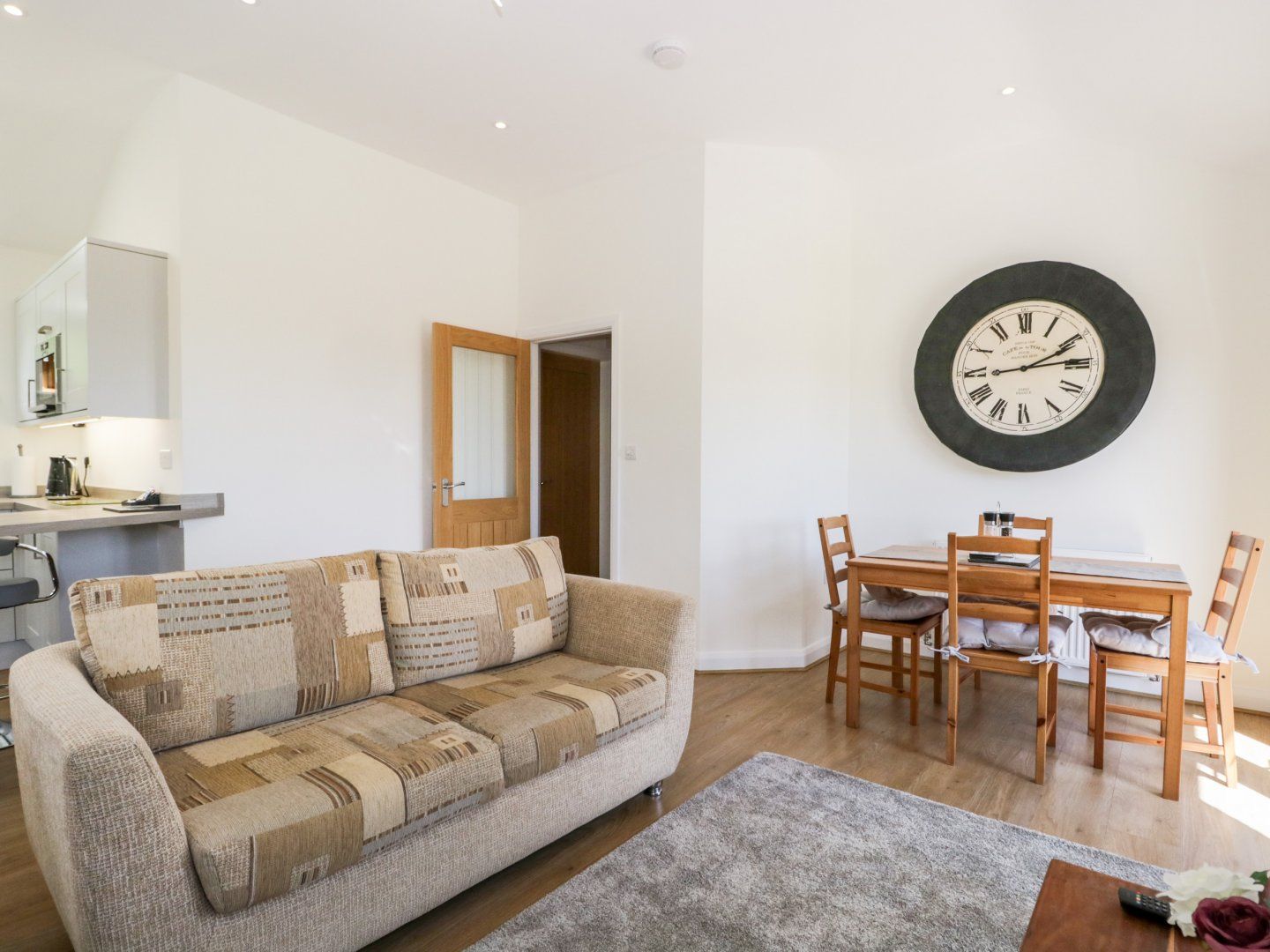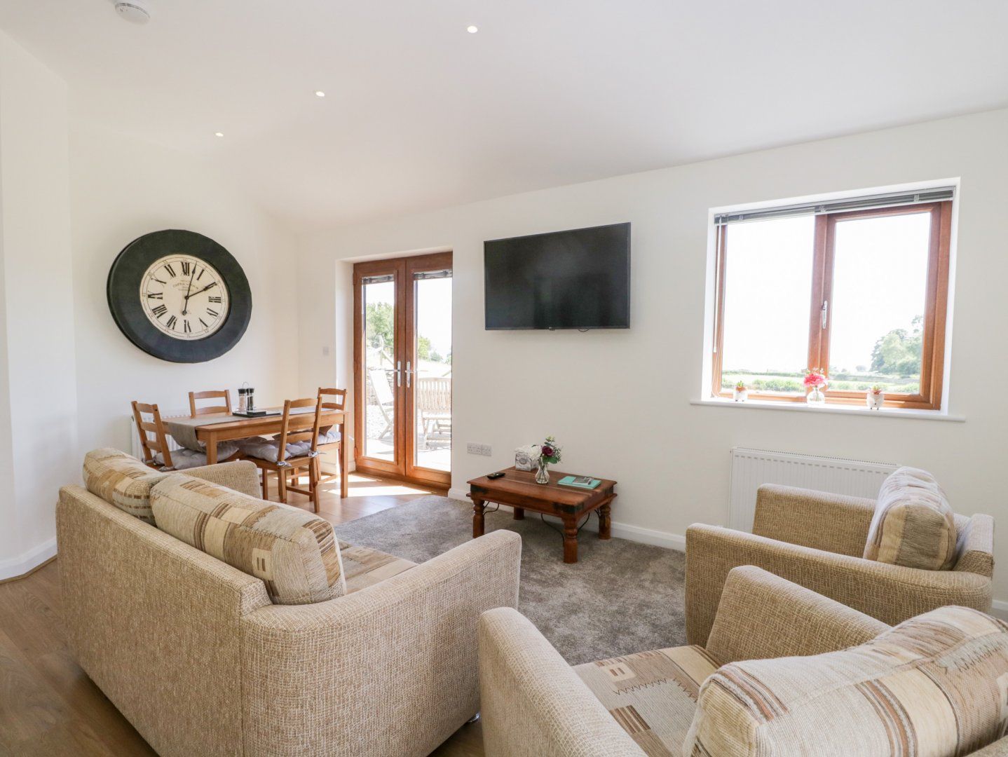 Single-storey. Two bedrooms: 1 x double with Smart TV, 1 x twin with Smart TV. Bathroom with bath, walk-in shower, basin, heated towel rail and WC. Open-plan living space with kitchen, dining and sitting area
