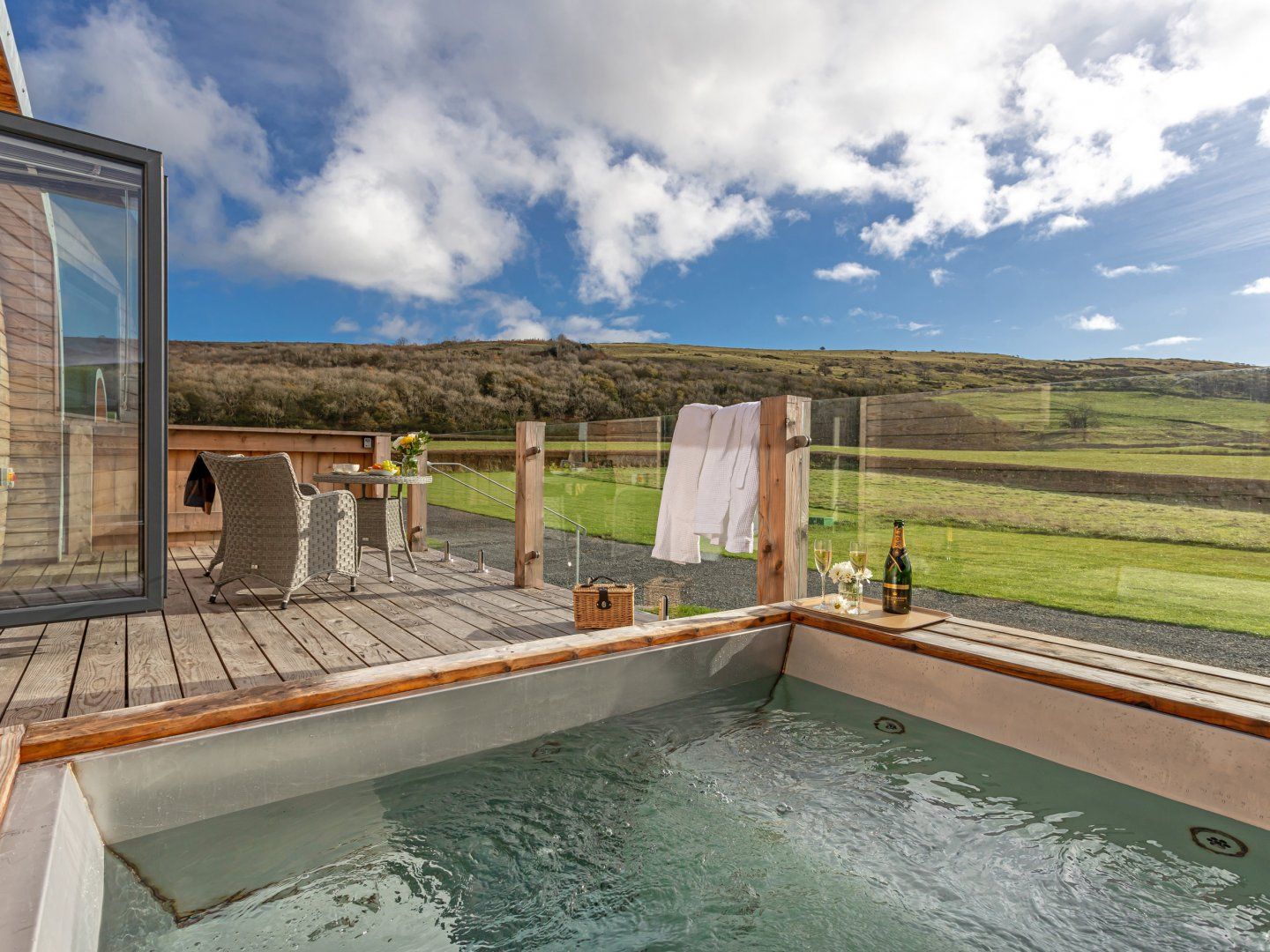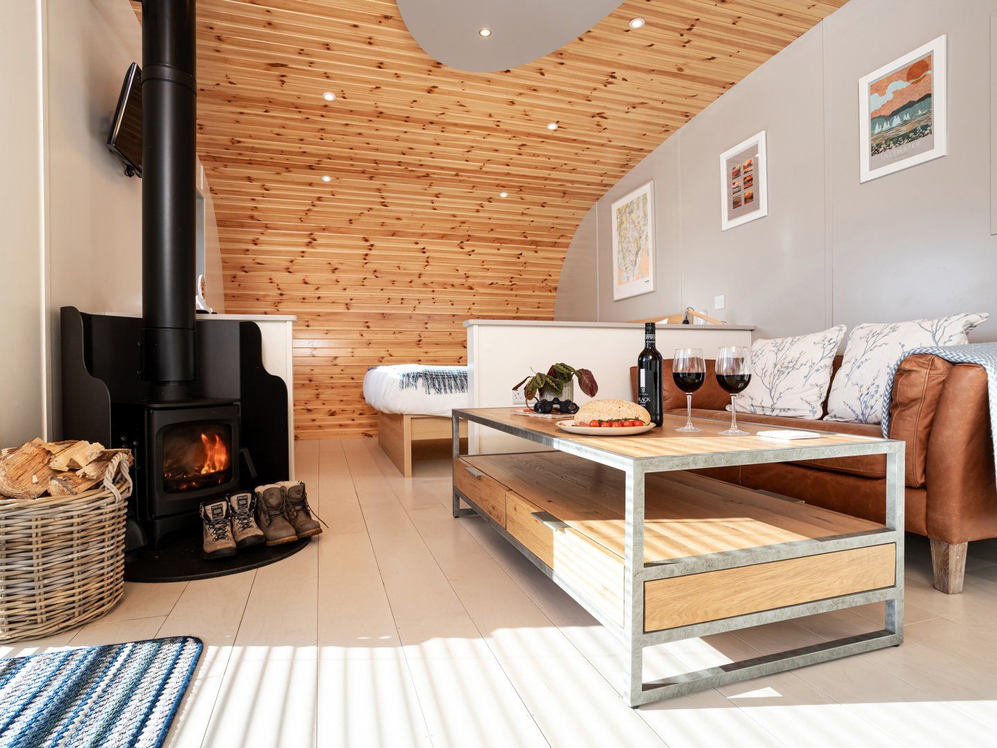 Amenities Central heating with woodburning stove. Oven, hob, microwave, fridge. WiFi. Fuel, power and starter pack for woodburning stove inc. in rent. Bed linen and towels inc. in rent. BBQ and hot tub. Secure storage for bikes and outdoor equipment. Ample off-road parking along with a fast electric charging point. Front balcony with hot tub and frosted glass. The pod has a 22 kilowatt electric vehicle charger. Sorry, no smoking. Note, this property is for adults only; no children or infants are permitted. Shop and pub 1.1 miles. Note: The hot tub is a bespoke design which features jets but no bubbles