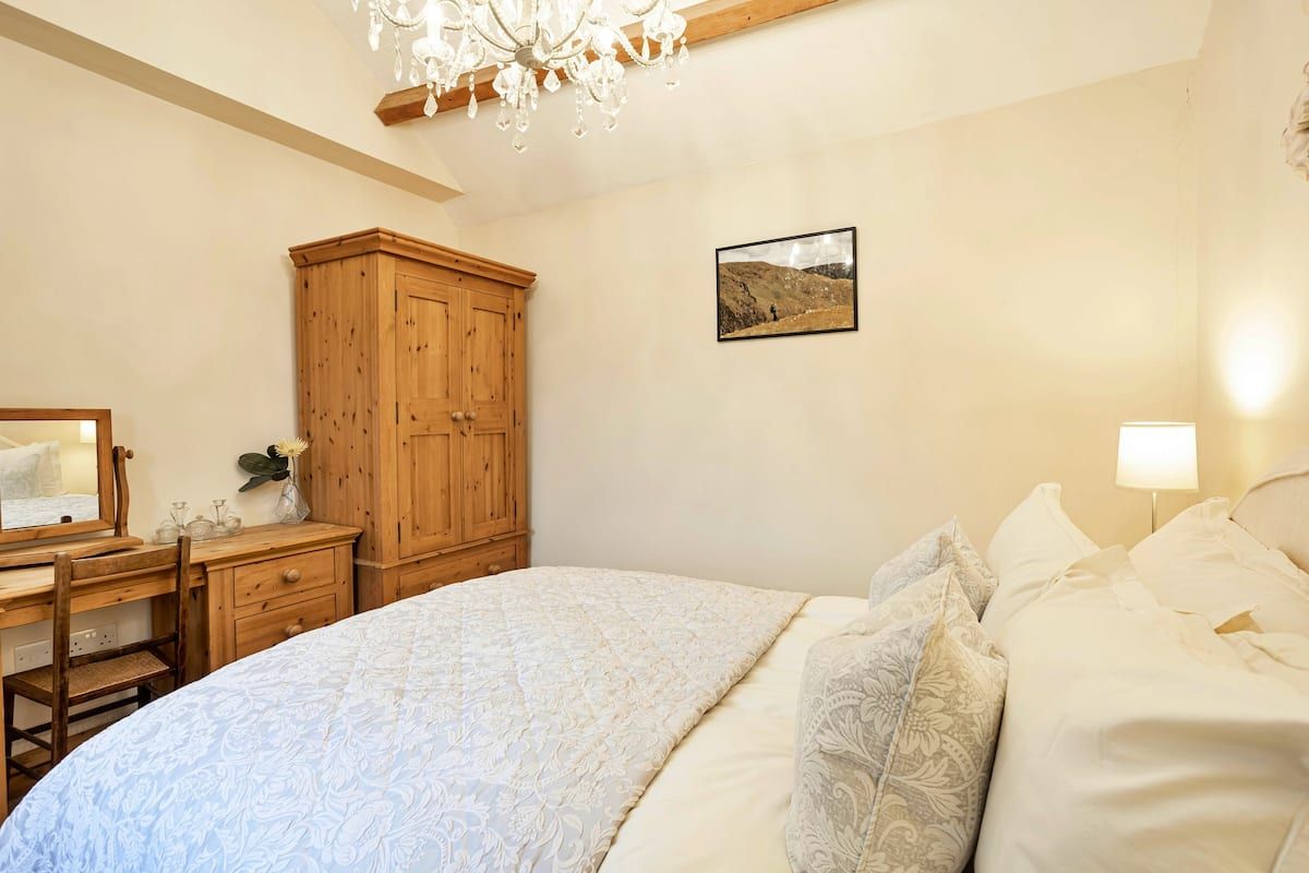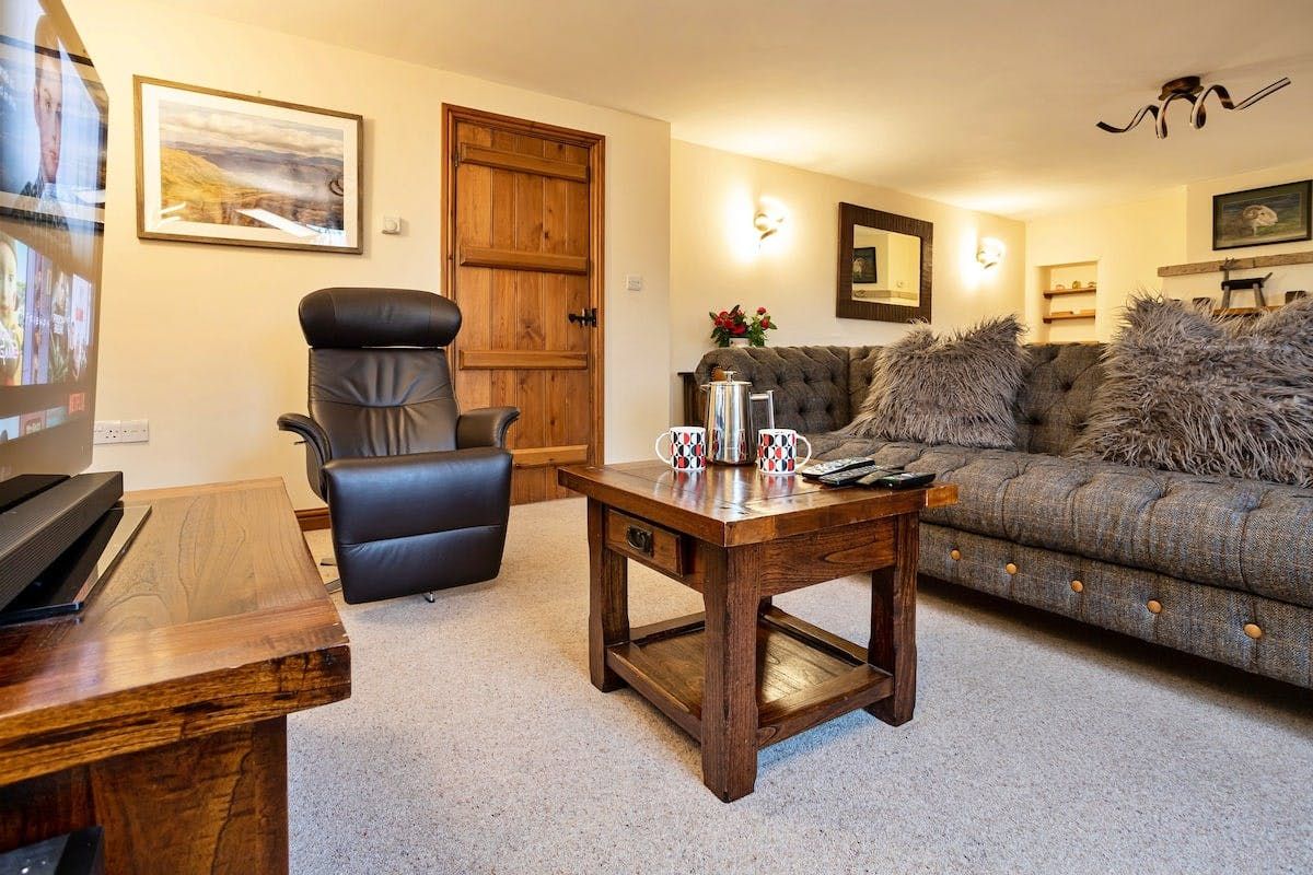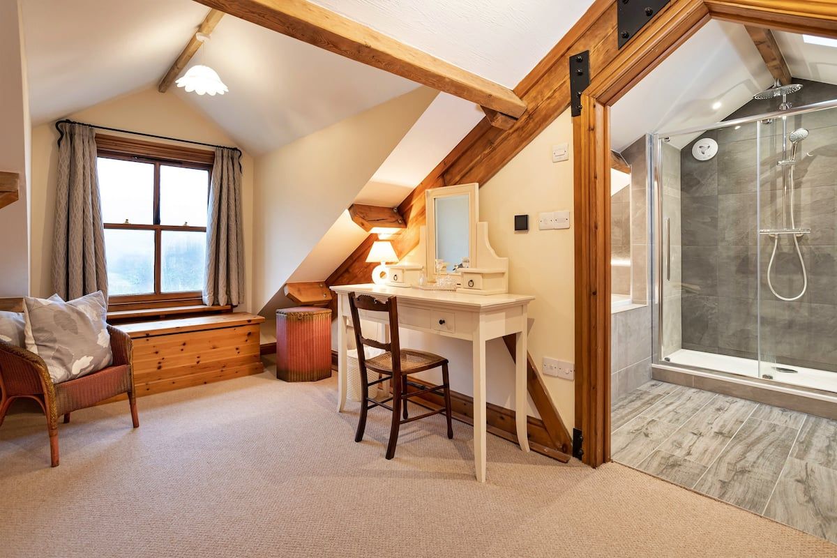 From the outside, this restored farmhouse is everything you’d imagine from a rustic home. We love the traditional masonry with chunky grey stones, a slated roof, and a dry stone wall around its perimeter. This continues inside, with a warm living space featuring carpeted floors – plus underfloor heating – solid hardwood furniture, tweed sofas, and a wood-burning stove. Of course a range cooker and sloped ceilings complete the look upstairs, as you explore the bedrooms through gorgeous barn-style doors. But tradition ends there.