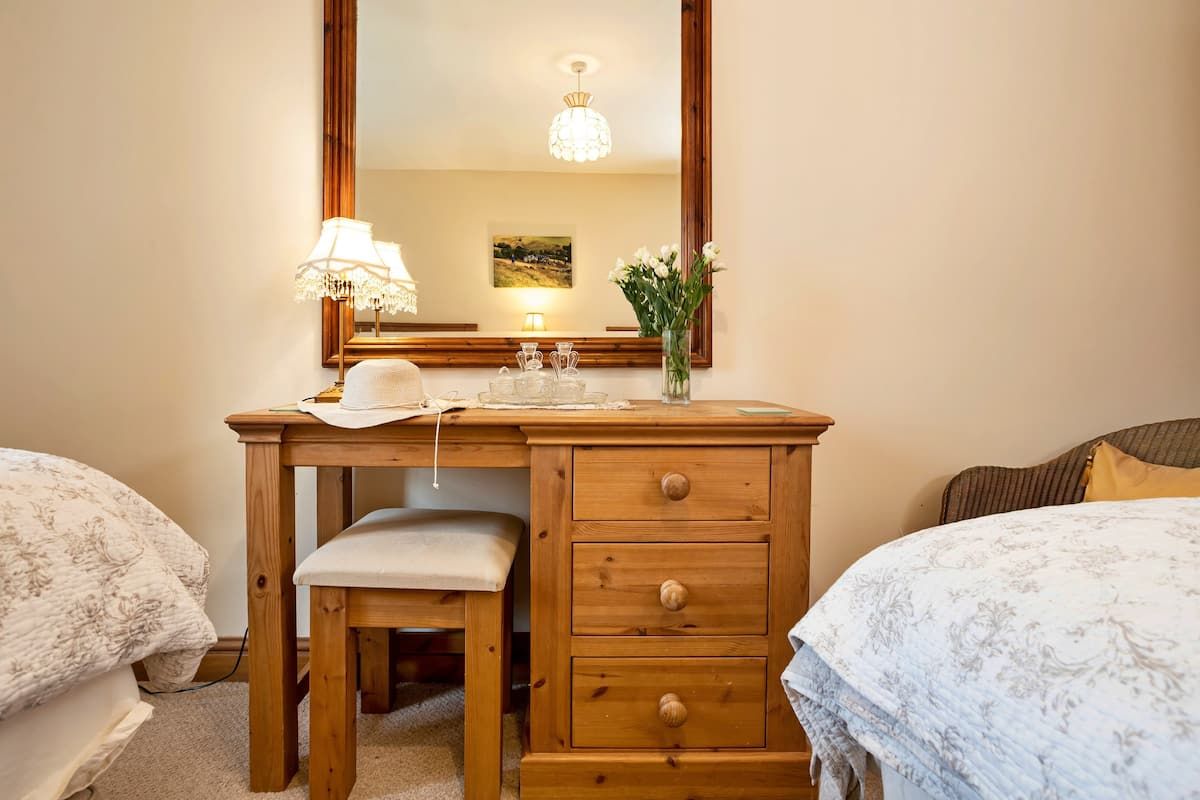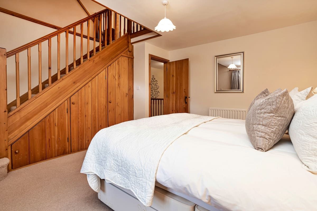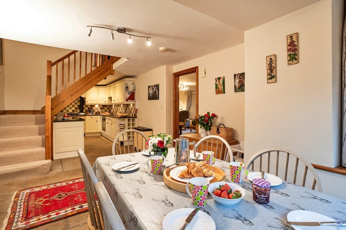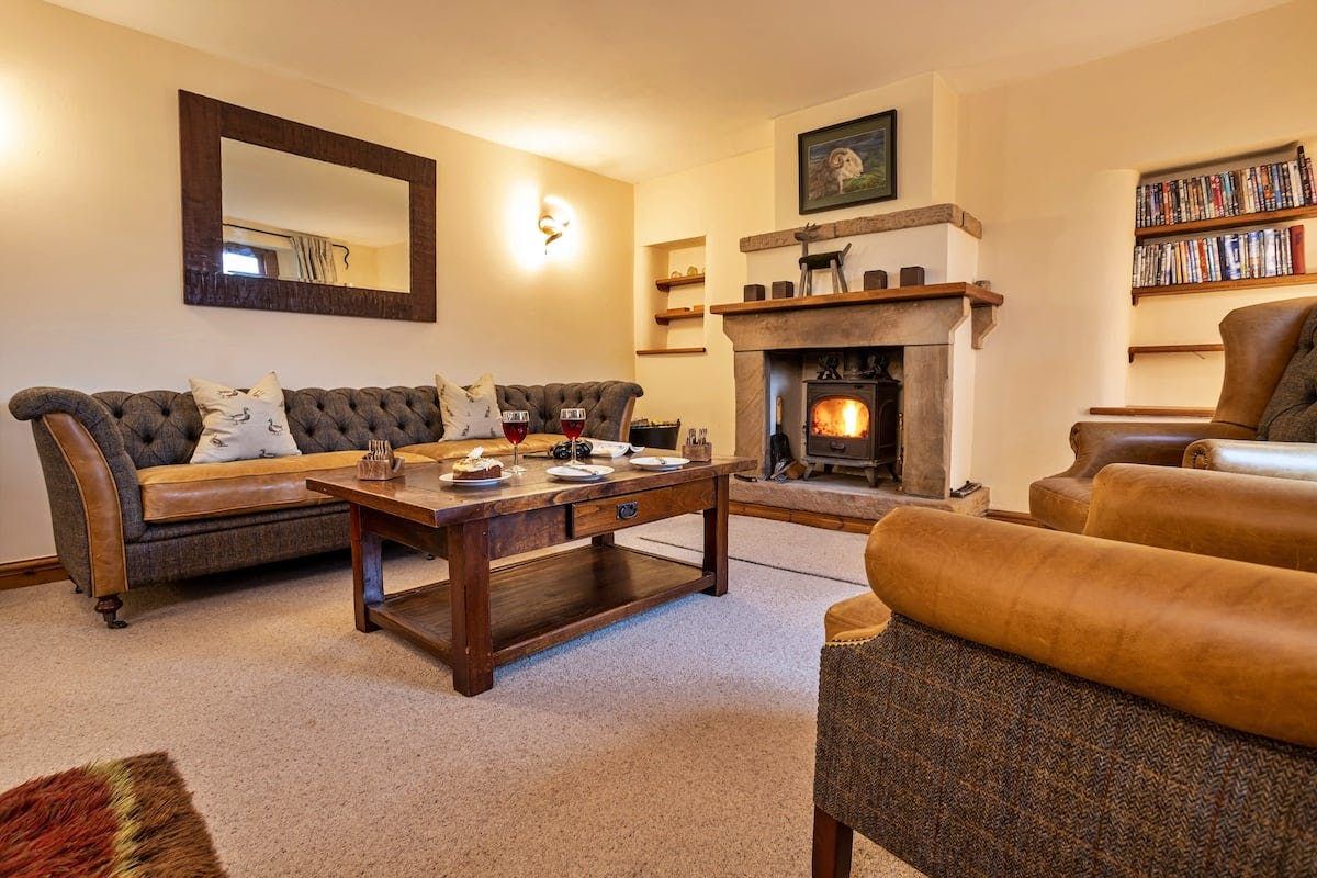 From the outside, this restored farmhouse is everything you’d imagine from a rustic home. We love the traditional masonry with chunky grey stones, a slated roof, and a dry stone wall around its perimeter. This continues inside, with a warm living space featuring carpeted floors – plus underfloor heating – solid hardwood furniture, tweed sofas, and a wood-burning stove. Of course a range cooker and sloped ceilings complete the look upstairs, as you explore the bedrooms through gorgeous barn-style doors. But tradition ends there.