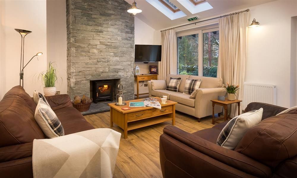 Spacious Lounge with patio doors, Feature fireplace, Log burning stove.