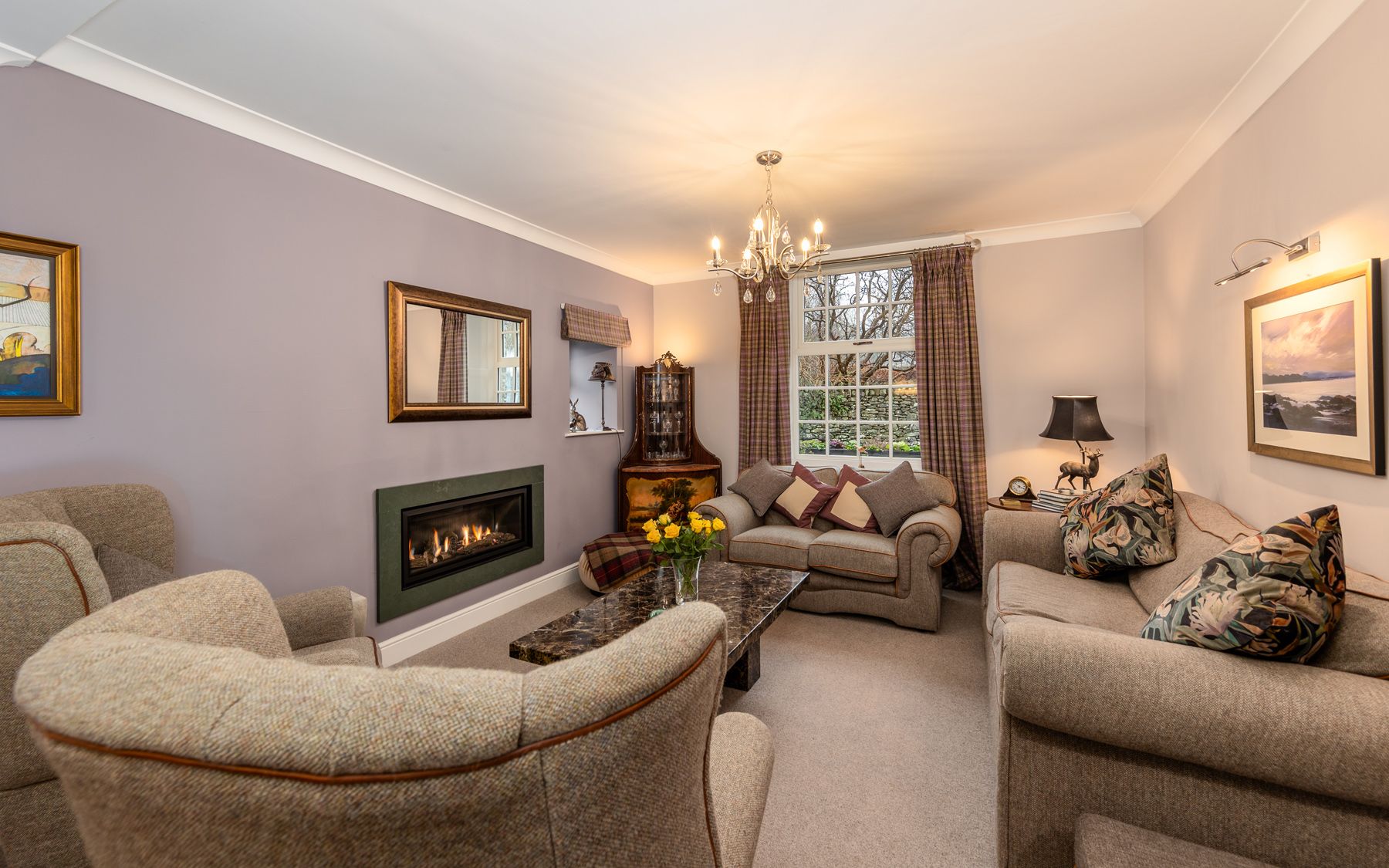 Amenities Self-cleaning oven, separate combi microwave oven, electric hob, fridge/freezer, combined washing machine/tumble dryer, dishwasher. Sitting room with Gazco flame effect gas fire.