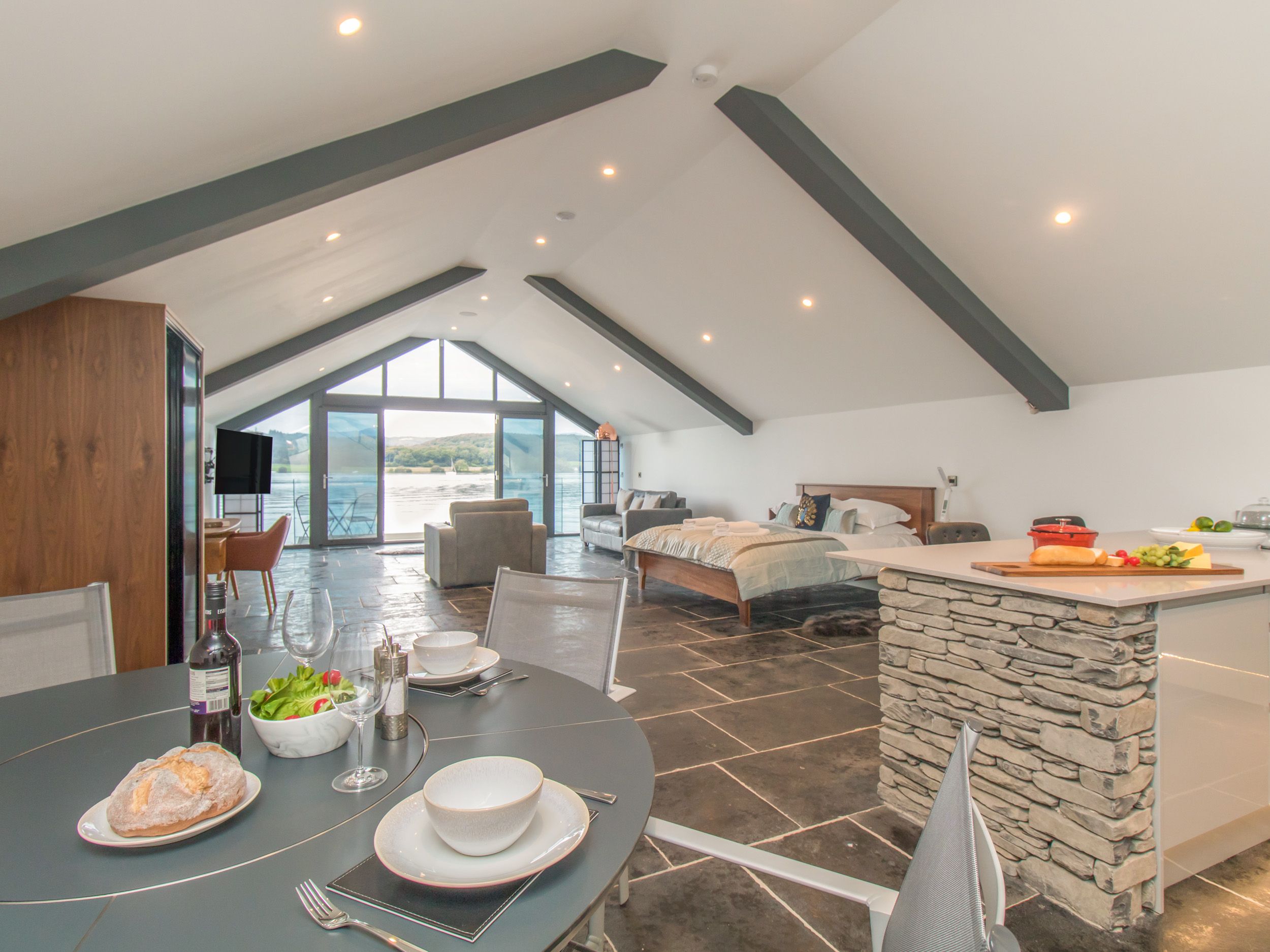Holiday home Boathouse on the Water is an enchanting boathouse conversion resting on the outskirts of Bowness-on-Windermere in the Lake District. There is one king-size-bedroom within the studio layout and a ground-floor shower room, making the property suitable to sleep up to two people. On the first floor is an open-plan layout holding the bedroom area as well as a kitchen, dining area and a siting area with a balcony. Outside is your own private hot tub as well as a designated parking space for one car. Boathouse on the Water is a dazzling dwelling, ideal for your romantic retreat in the Lake District.