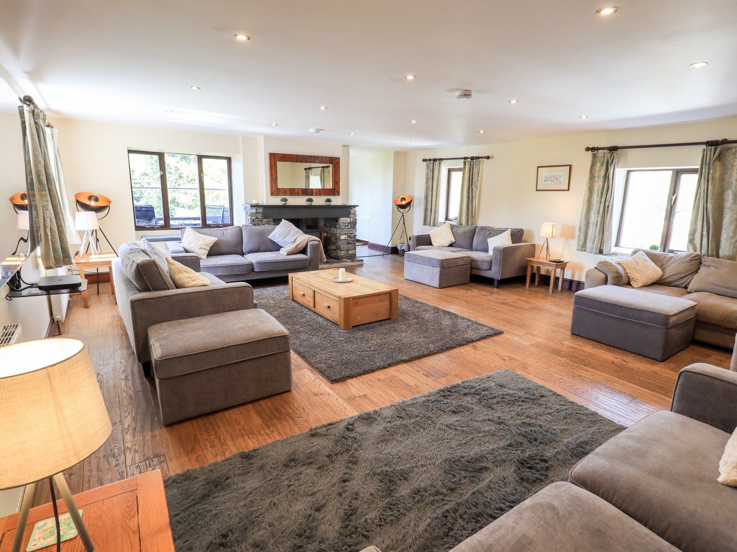 Accomodation Details Six bedrooms: 1 x king-size with en-suite bathroom, jacuzzi bath, separate shower, basin and WC, 4 x double (3 located on the ground floor), 1 x twin bunk bedroom (4 full-size beds). 1 x ground floor bathroom with jacuzzi bath, separate power shower, basin and WC, 1 x shower room with basin and WC, 1x first floor cloakroom with basin and WC, 1 x ground floor cloakroom with basin and WC. Kitchen with access to patio through utility room. Dining room with woodburning stove. First floor sitting room with access to balcony. Games Room. Office.