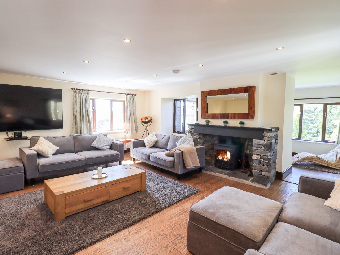 Amenities Oil central heating with woodburning stove. Electric double oven and hob, microwave, fridge, freezer, wine fridge, washing machine, tumble dryer, 75” smart TV with Sky TV including Sports, WiFi. Fuel and power inc. in rent. Bed linen and towels inc. in rent. Cot and highchair available. Off road parking for 6 cars. Enclosed lawned gardens with patio and sun terrace with furniture. Coal BBQ. Two well-behaved pets welcome. Sorry, no smoking. Pub 11 mins walk. Shop 2.6 miles.