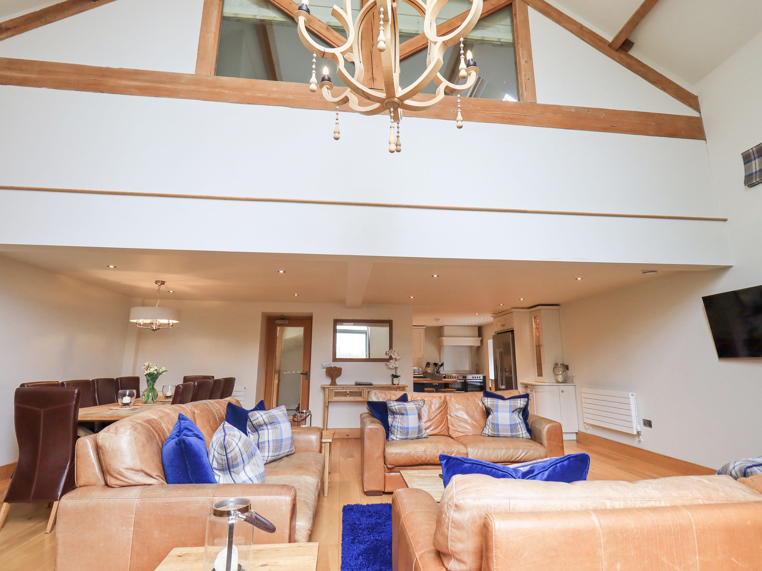 The 5 bedrooms are split between the ground floor and second floor, 3 of these have on-suits with showers the other two bedrooms each have a bathroom across from it with a bath and shower, each bedroom has plenty of space and storage and is equipt with a smart t.v, hairdryer and plenty of towels. The 3 ground floor bedrooms also have outside access to either the court yard or the hot tub/ outside dining area, there are also flip flops and blankets supplied for outside use. also on the ground floor is a utility room with a washer and dryer, clothes rack, hover,iron and ironing board.