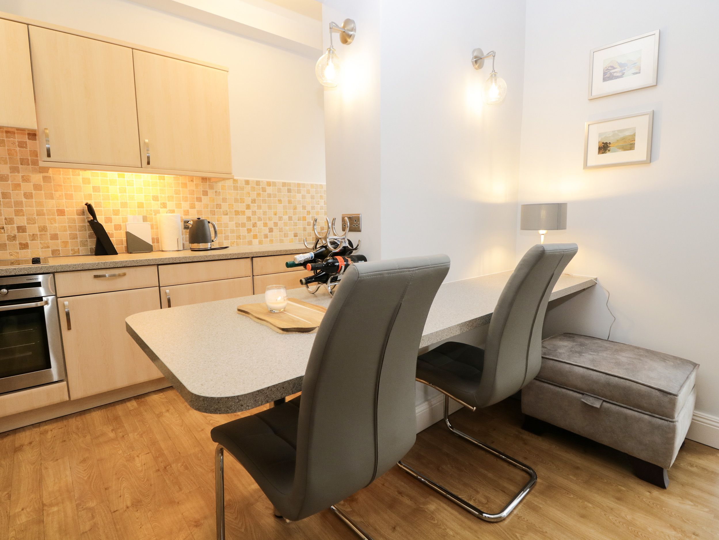 Accomodation Details First-floor apartment. Two bedrooms: 1 x king-size, 1 x double. Bathroom with small P-shaped bath with shower over, basin, heated towel rail and WC. Open-plan living space with kitchen, dining area and sitting area with electric flame-effect fire