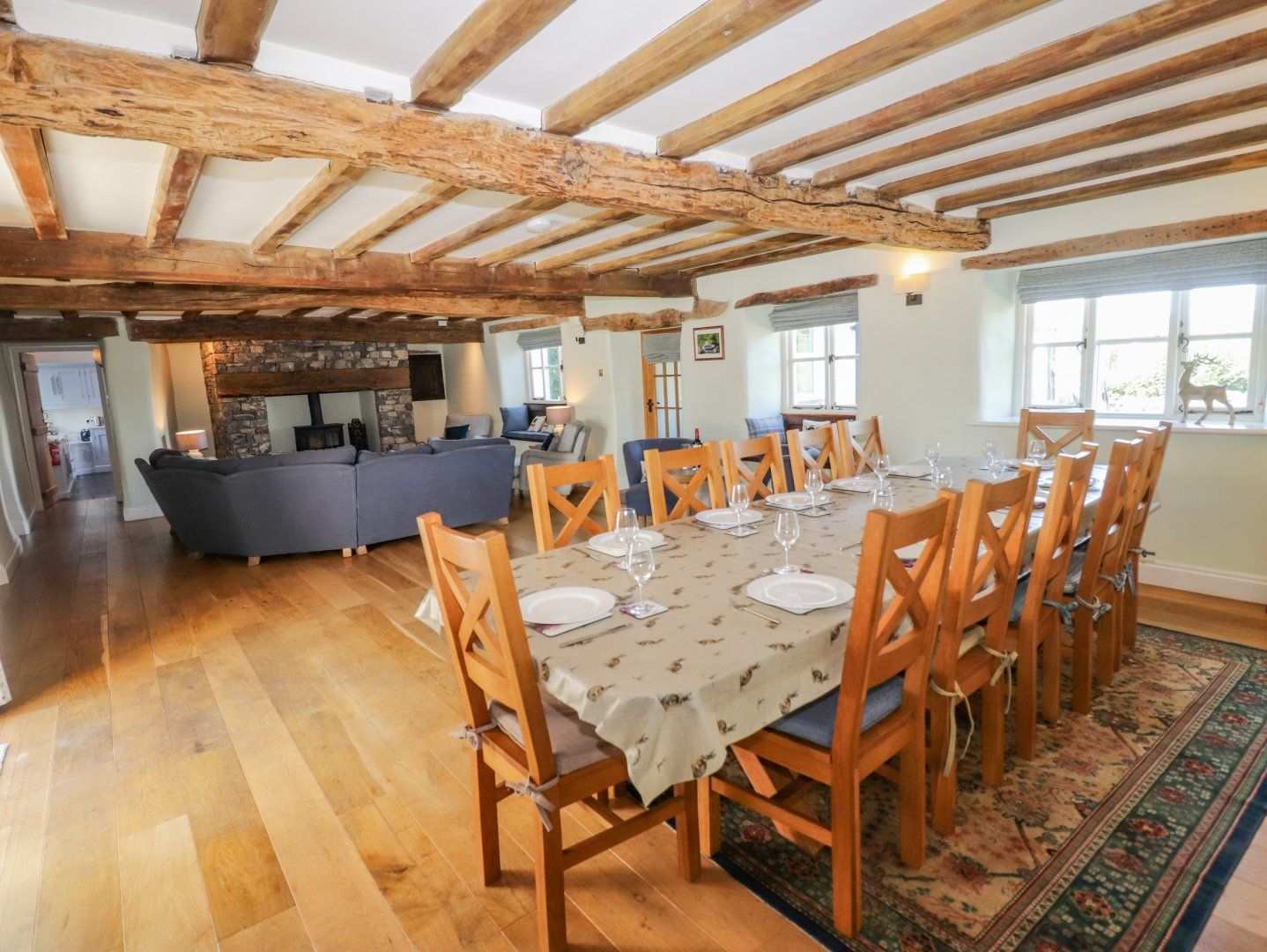 Accomodation Details Highly Commended 4 Star property. Six bedrooms: First floor: 1 x double with en-suite shower, basin, WC, 1 x super king with en-suite shower, basin, WC, 2 x twin, 1 x king, bathroom with bath, with shower over, basin and WC. Second floor: 1 x king with en-suite bathroom with bath, twin basins and WC. Ground floor basin and WC. Utility room. Kitchen with dining area. Sitting room with dining area and wood burning stove. Sunroom. Snug with wood burning stove.