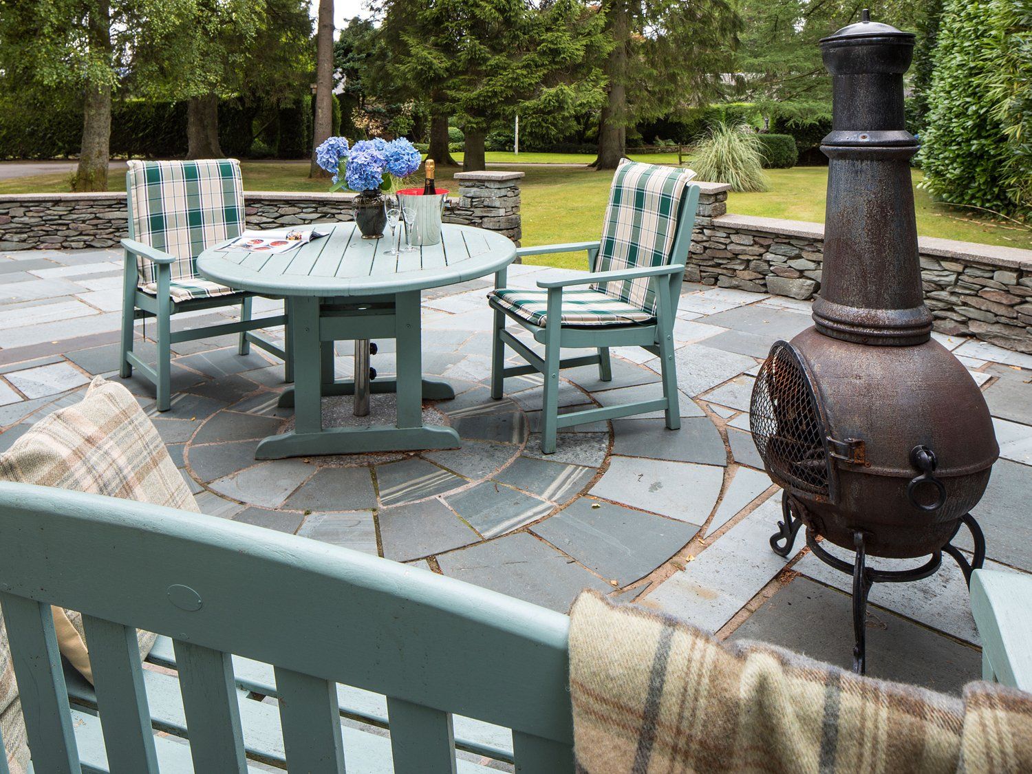 Additional private patio area with furniture and chiminea.