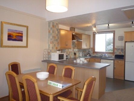 Two ground floor bedrooms: 1 x double with en-suite bathroom, 1 x twin. Bathroom with shower, basin and WC. Shared utility. Hallway with heated drying/storage cupboard. First floor open plan living area with kitchen, dining area and sitting area with pull-down double bed and balcony.