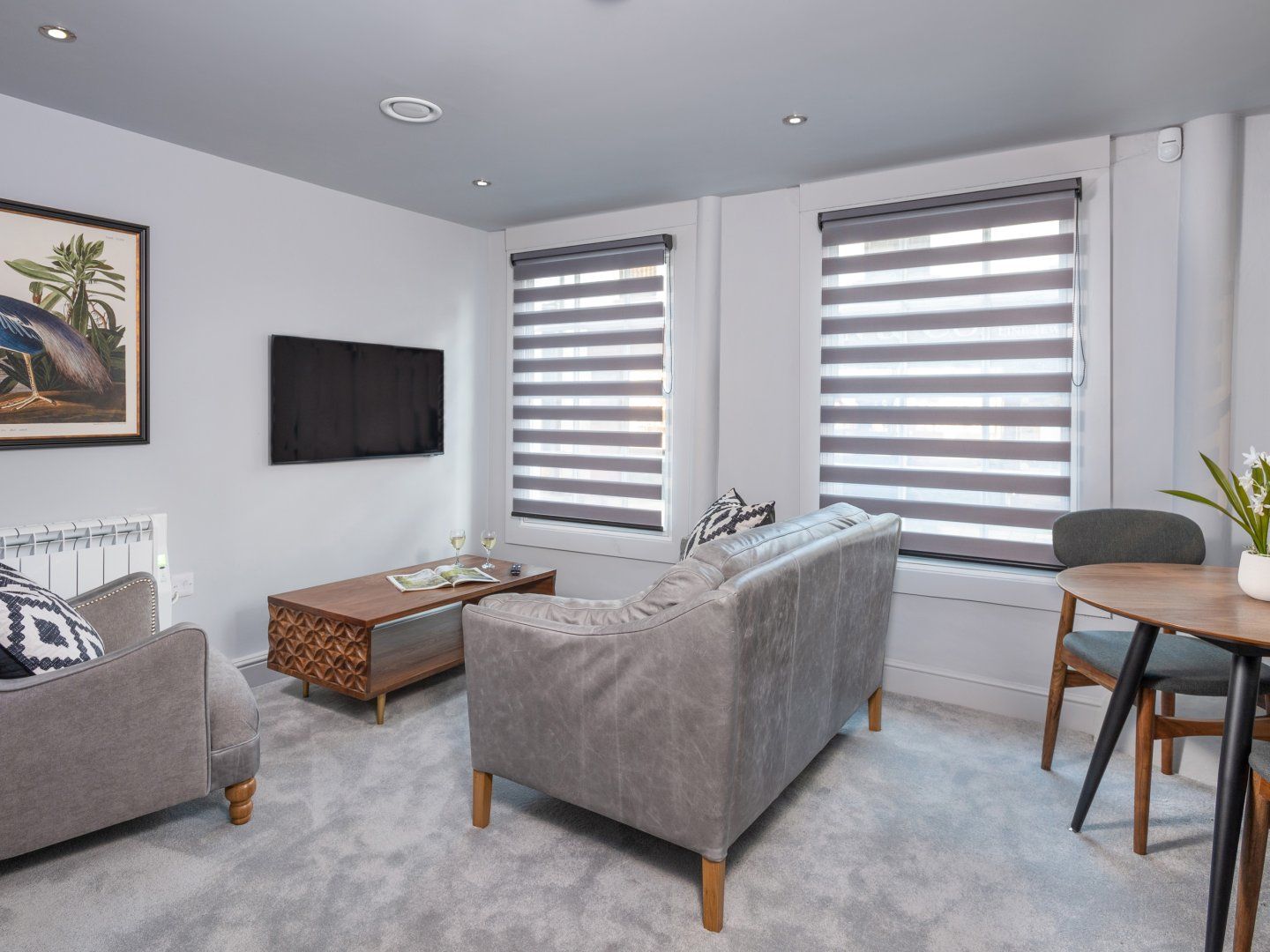 Accomodation Details Ground-floor apartment. One king-size bedroom with Smart TV and en-suite bathroom with freestanding bath, handheld shower, basin, heated towel rail, and WC. Open-plan living space with kitchen, dining area and sitting area
