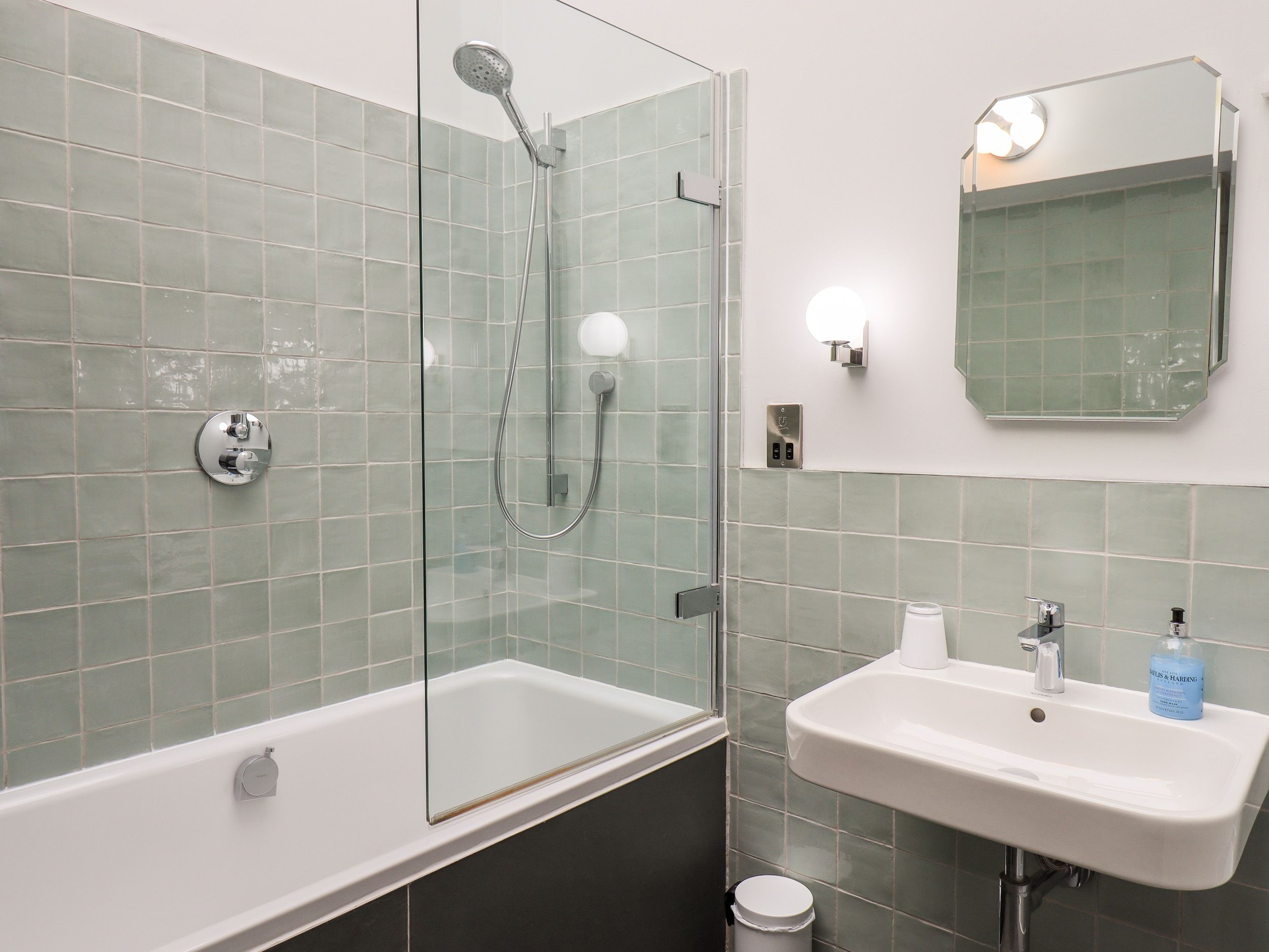Four bedrooms: 3 Ensuite bathrooms and one family bathroom. 1 x upper ground-floor twin beds, 2 x upper ground-floor king-size with en-suite shower, basin and WC, 1 x lower ground-floor king-size with en suite bathroom with roll top bath, shower over, basin and WC. Open-plan living space with kitchen, dining table and sitting area with woodburning stove.