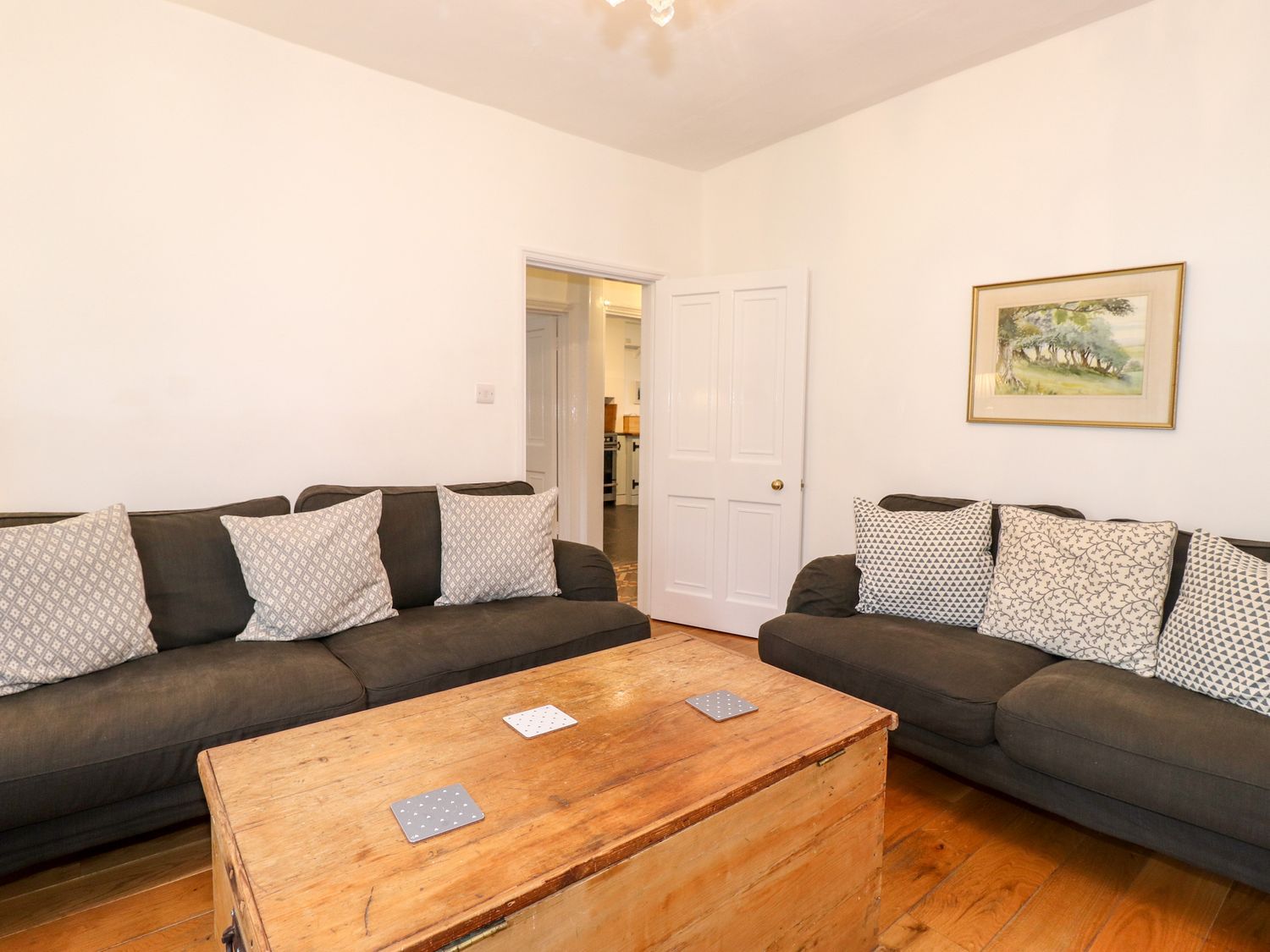 Over three floors. Four bedrooms: 1 x second-floor king-size, 1 x king-size, 1 x twin with balcony, 1 x twin. Bathroom with bath, walk-in shower, basin and WC. Second-floor shower room with walk-in shower, basin and WC. Ground-floor shower room with walk-in shower, basin and WC. Kitchen/diner. Utility. Dining room with woodburning stove. Sitting room.