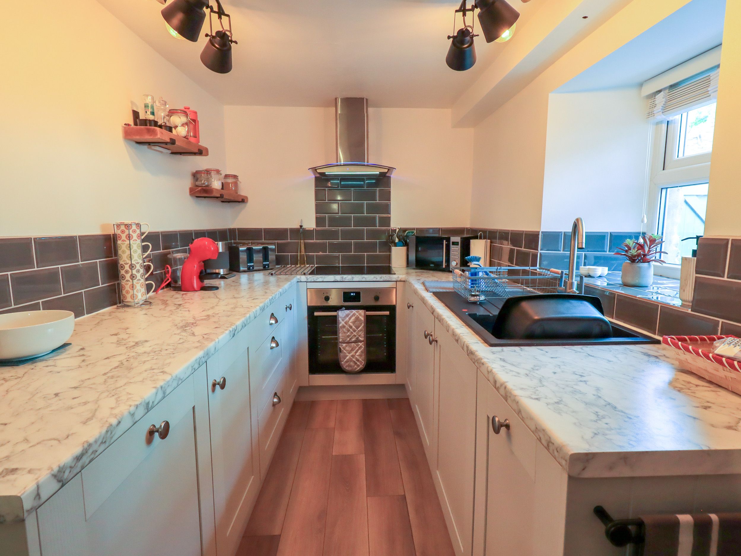 Amenities Central heating. Electric oven and hob, microwave, fridge, dishwasher, coffee maker. Smart TV, WiFi. Fuel, power, and starter pack for woodburning stove inc. in rent. Bed linen and towels inc. in rent. Roadside parking. Enclosed rear garden with patio. One well-behaved dog welcome. Travel cot available. Sorry, no smoking. Shop and pub 0.1 miles, river 0.2 miles. Note: The garden is accessed through the neighbouring property. Note: Steps in garden, please take care