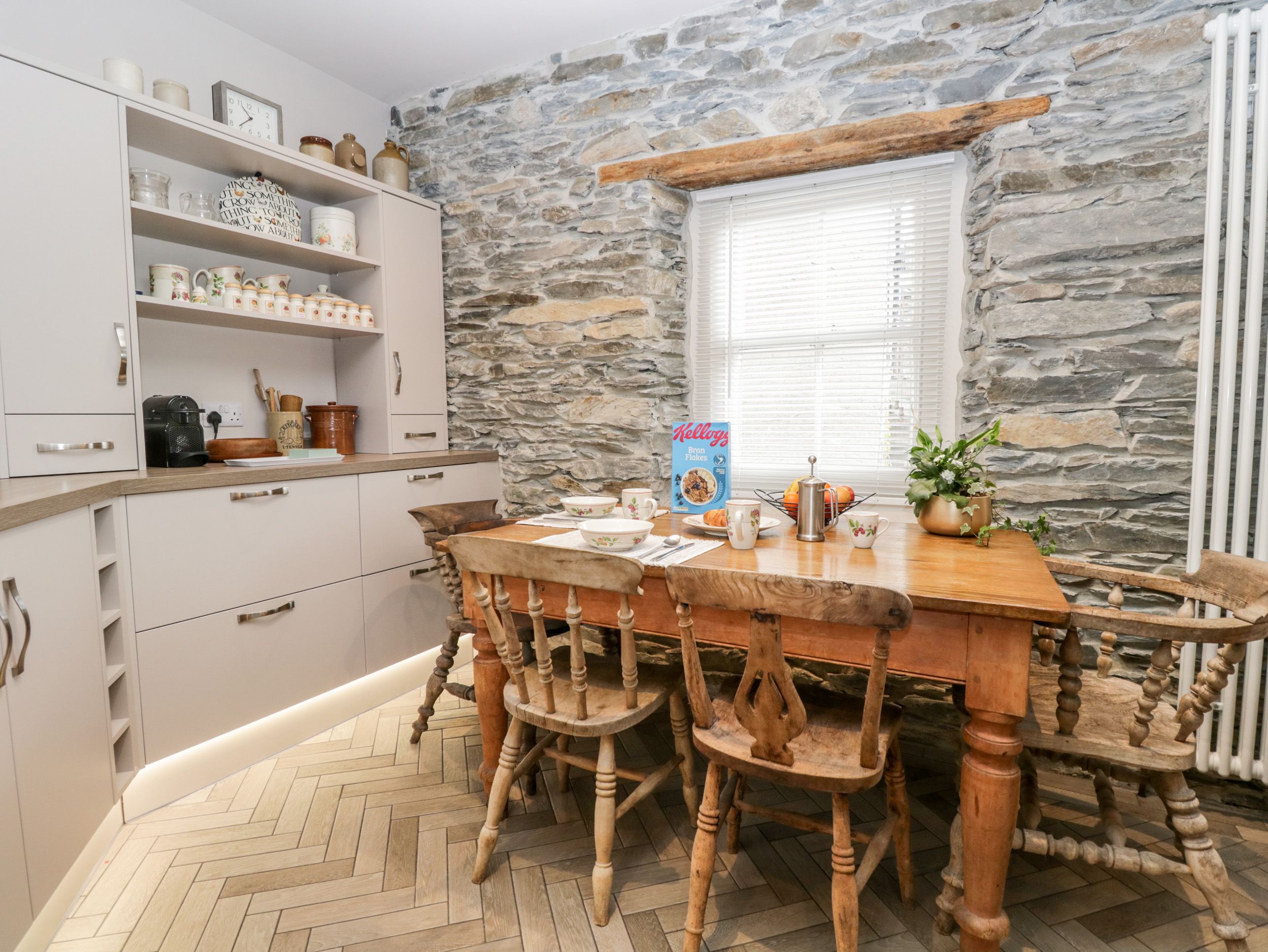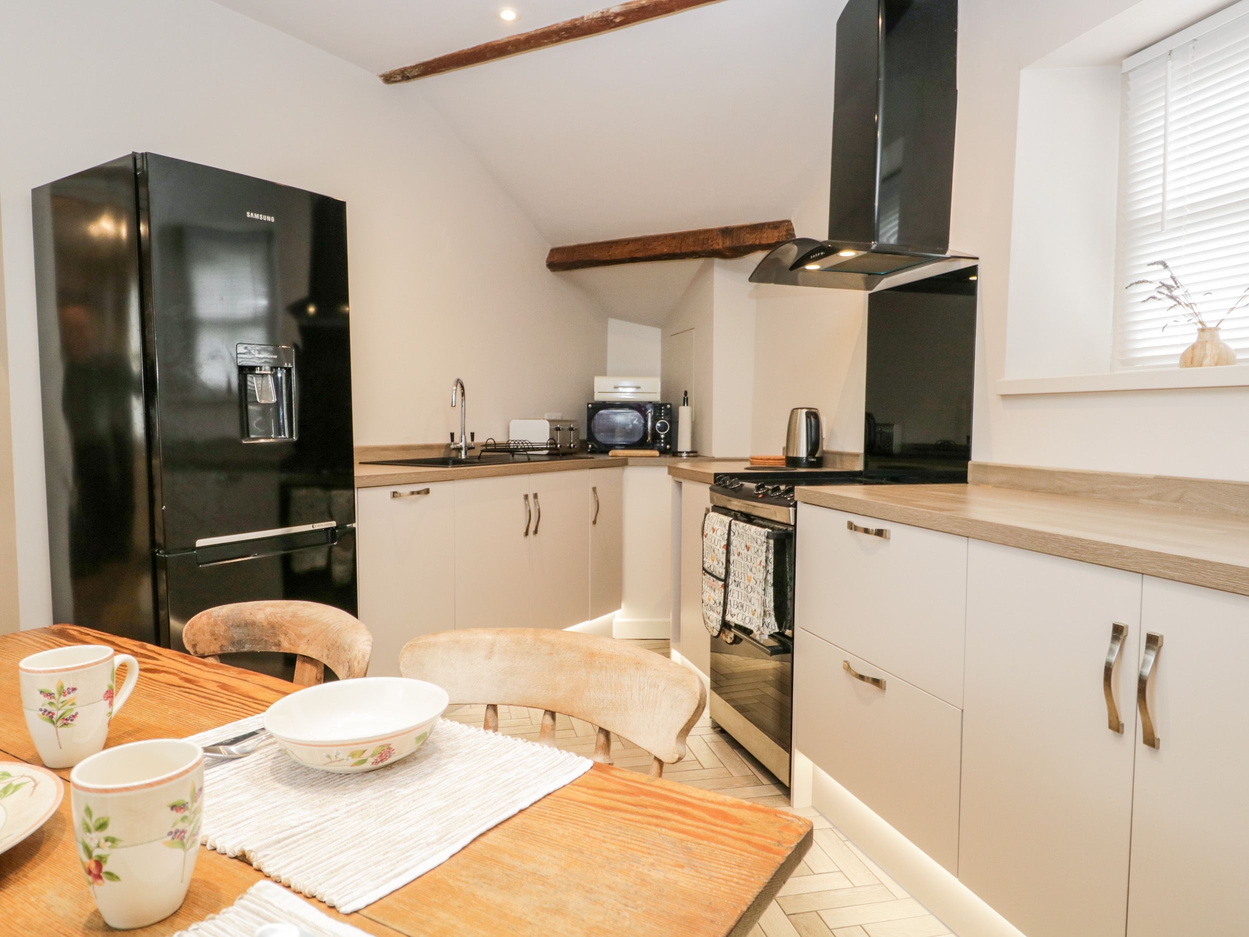 Entry for parking tight over deep step and onto back of mainly derelict buildings. Hard to get out because of big lip to ease up over onto road. Had to find gravel to take up the drop to give tyres purchase. 2 small mirrors to help on post opposite. Both dirty. Loads of fluff and dust under beds. Plastic bottle and tissues under mine, which was horrible to find. Dog hairs and debris under sofa seats, and seats have springs in which I found were uncomfortable. Kitchen nice, well equipped, but food crumbs in drawers and many baking sheets and pans greasy with burnt debris under bases. Had to wash everything we used first. Bathrooms are ok. We had heavy rain and water poured through lounge windows so much we were catching it in tubs and had to remove window seating. Also ran in through snug wall which is an internal wall. Voicemail left. No response from owner. Dog poo in garden which previous owners should have cleaned up. Garden obviously not checked, and needed attention Couldn't open small bedroom window as guttering overflows straight onto window ledge and water comes in. Windows and frames dirty. Yes, a quaint traditional cottage with character. Wonky walls and floors, (not a rug or carpert anywhere in the place, just floor boards which feel very dodgy in some places. Would not return. Would not recommend. Spoilt our break.