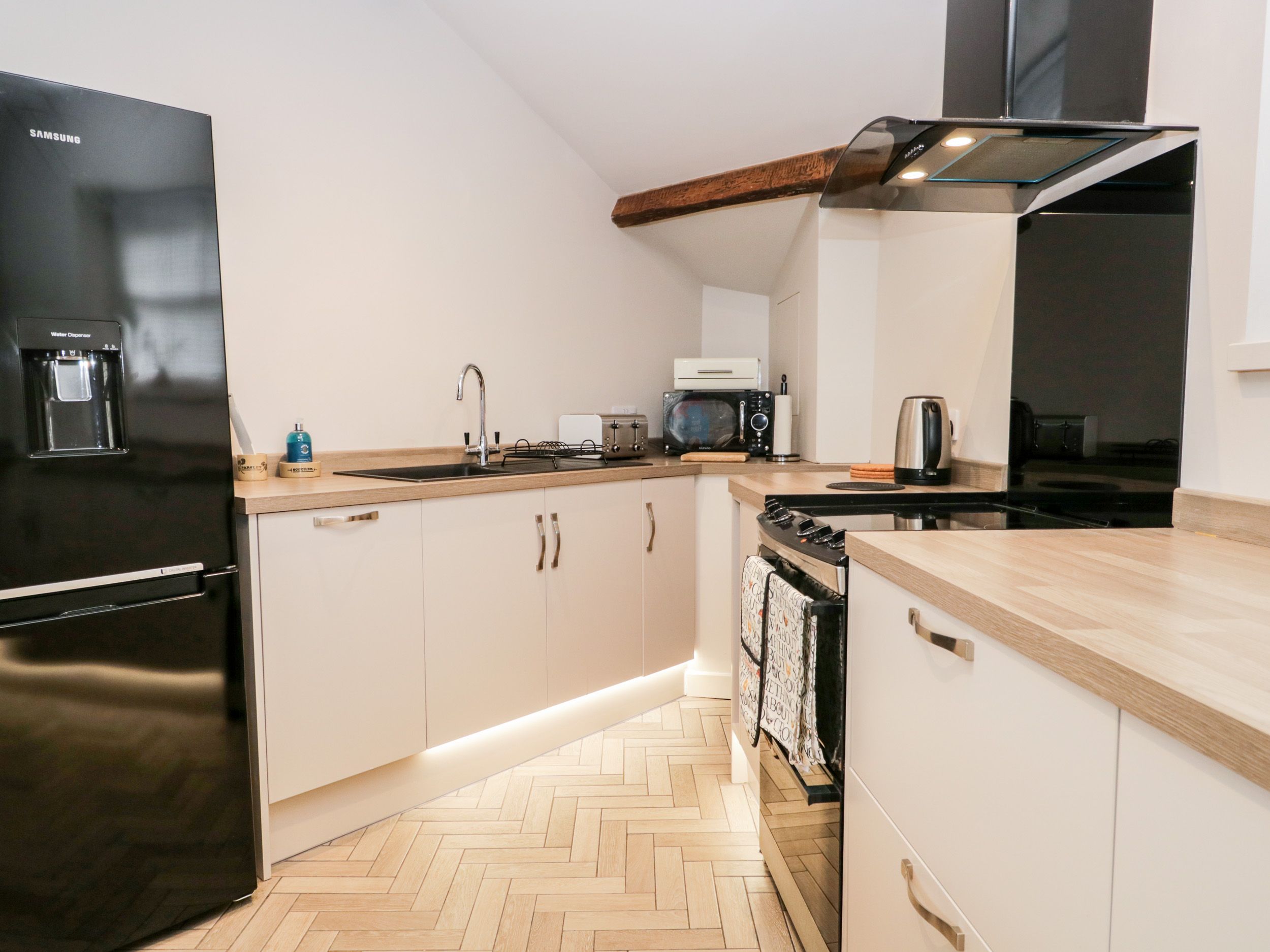 Three bedrooms: 1 x double, 1 x kingsize, 1 x twin (zip/link can be made into super-king on request). Bathroom with underfloor heating, bath, shower over, basin, heated towel rail and WC. Ground-floor shower room with underfloor heating, walk-in shower, basin, heated towel rail and WC. Kitchen/diner. Electric oven and hob, microwave, fridge/freezer, washer and dryer, dishwasher, Living/dining room with woodburning stove. Snug