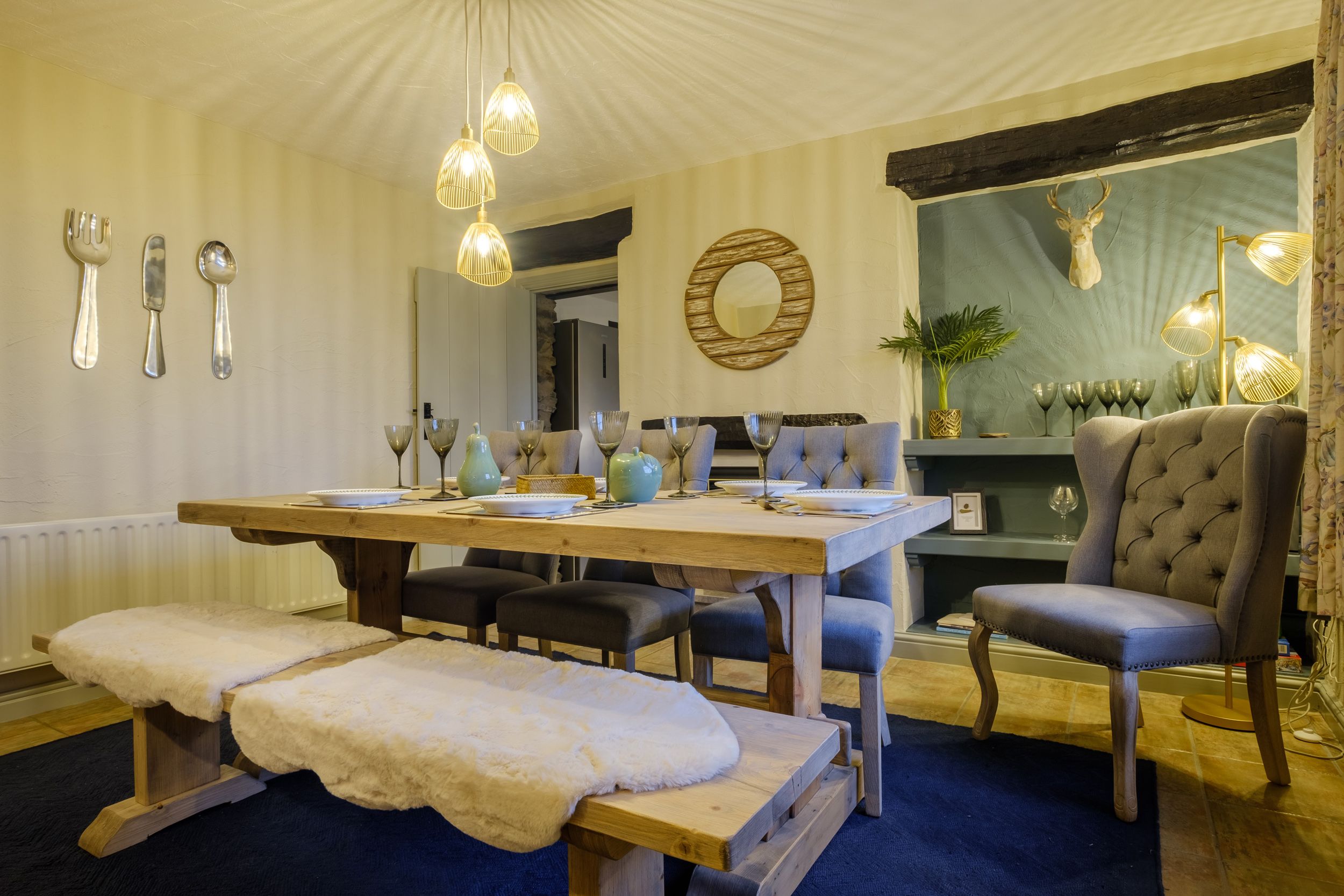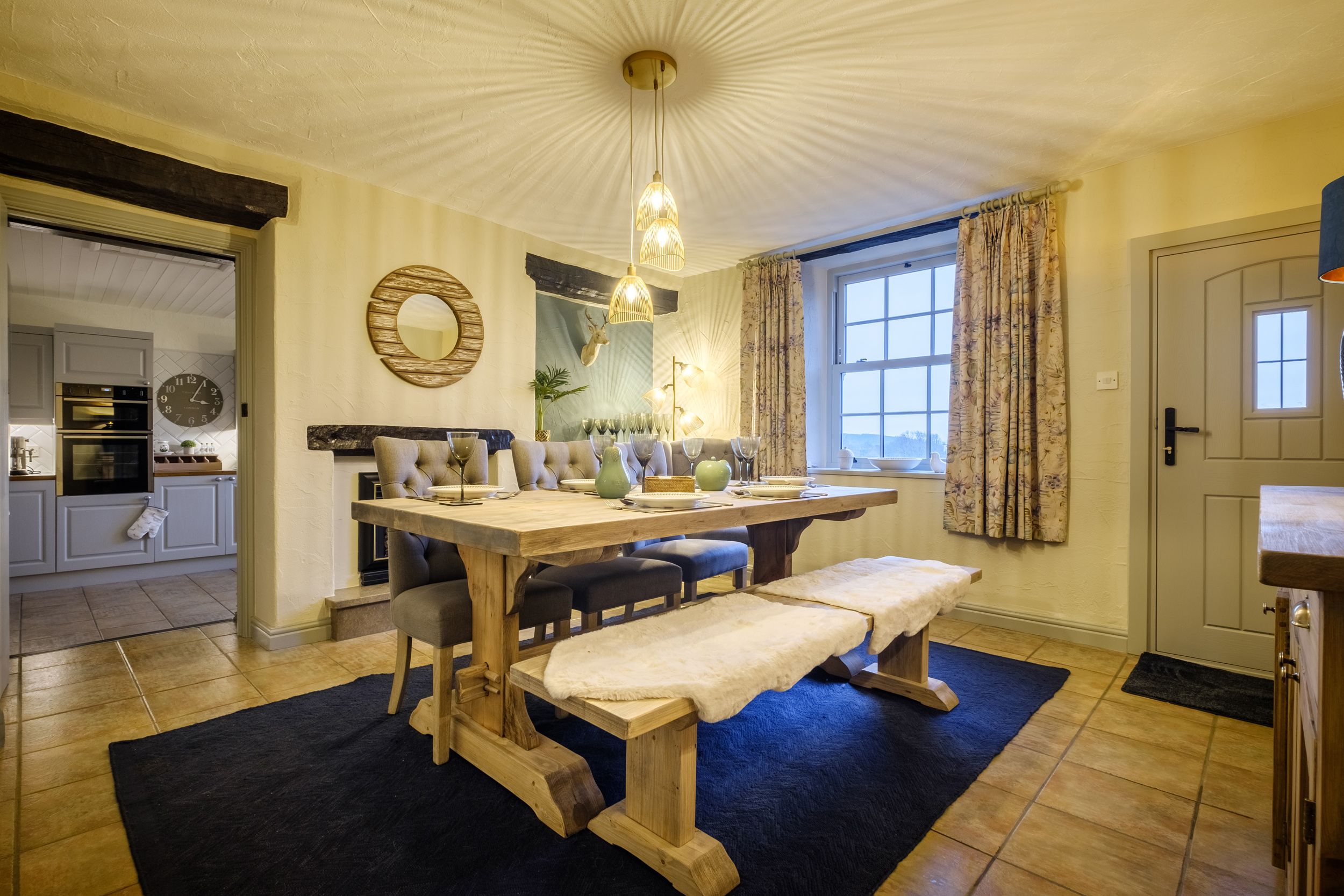 Over three floors. Three bedrooms: 1 x super-king-size, 2 x king-size. Bathroom with walk-in shower, corner bath, basin and WC. Second-floor bathroom with freestanding bath, walk-in shower, basin and WC. Cloakroom with basin and WC. Kitchen. Spacious dining room. Sitting room with woodburning stove. Boot room. Second-floor snug with TV