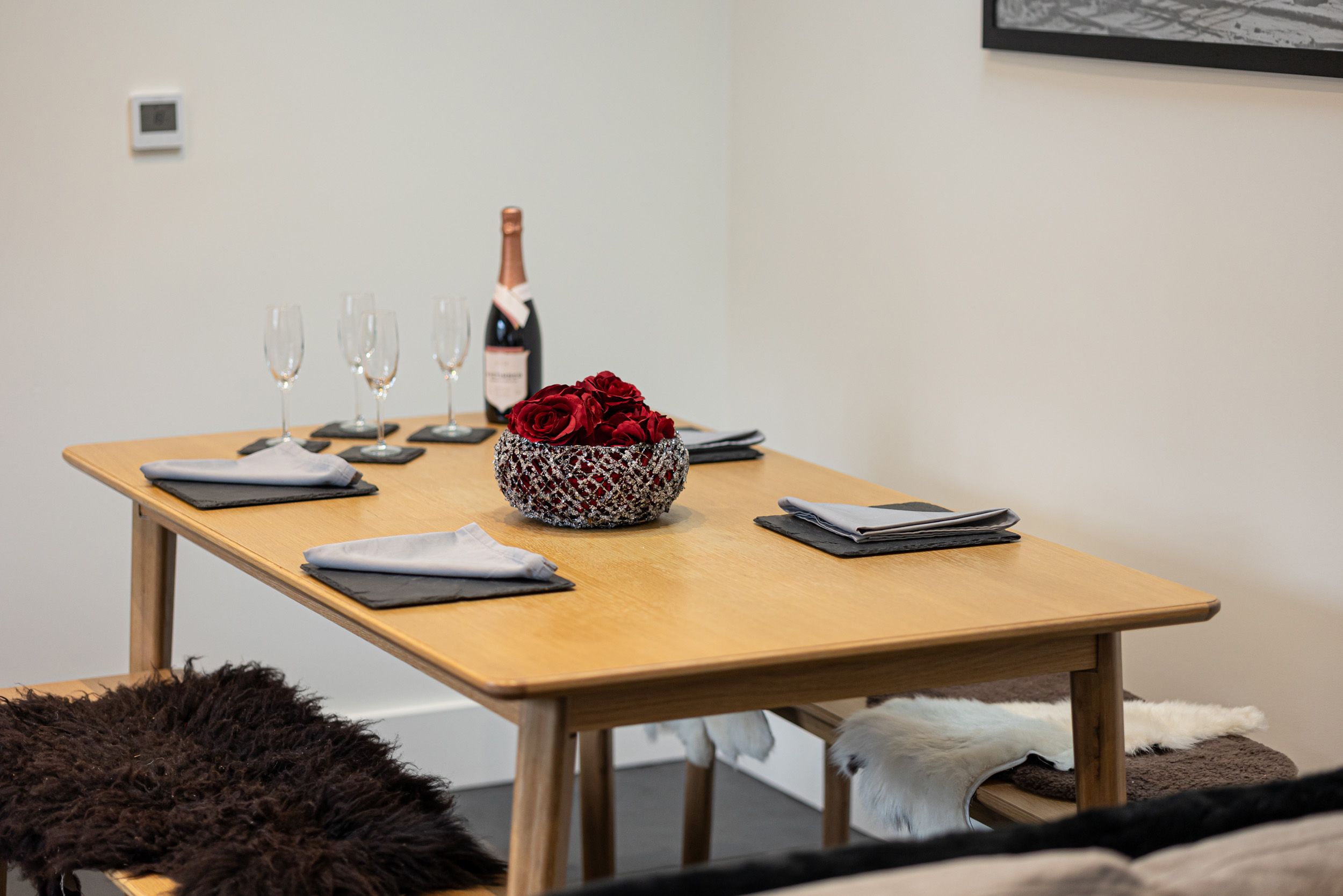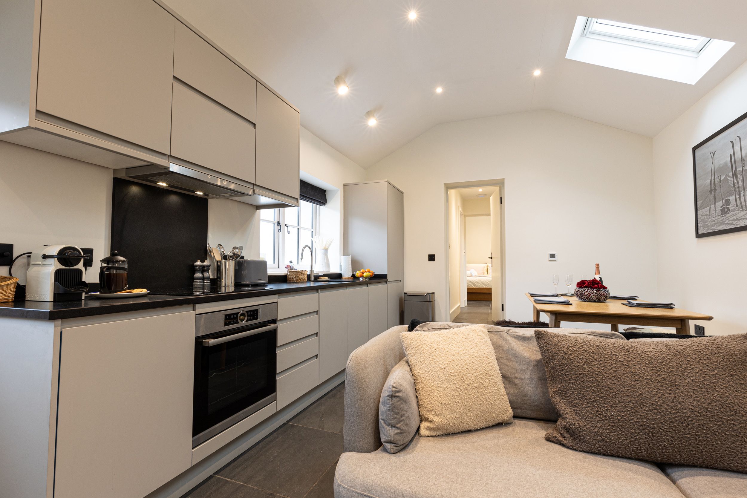 Accomodation Details Two bedrooms: 1 x king-size, 1 x double. Shower room with walk-in shower, basin, heated towel rail, WC, and washing machine. Shower room with walk-in shower, basin, heated towel rail, and WC. Open-plan living space with kitchen, dining area, and sitting area with woodburning stove