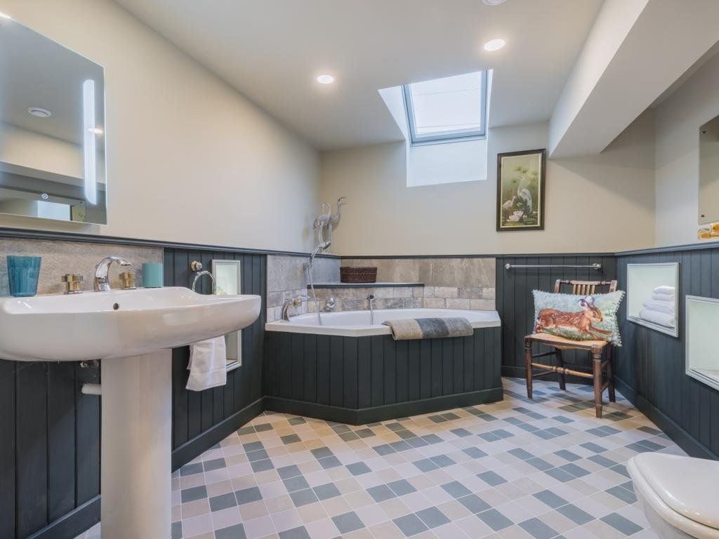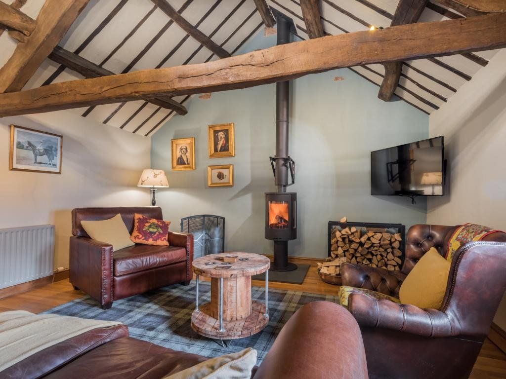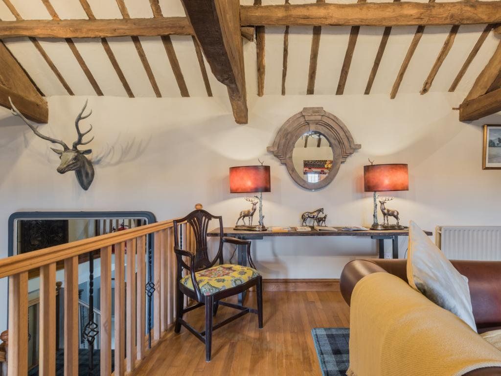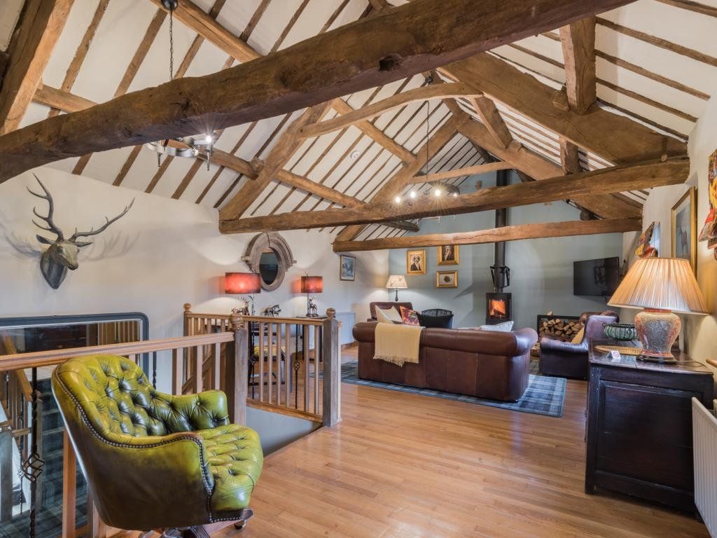 The upstairs living room is a stunning vaulted space with exposed roof timbers and a large wood burner for cosy evenings lounging on the sofa round the fire. Traditionally furnished and perfectly finished with paintings and ornaments befitting the room, it has an effortlessly timeless style, inviting you to sit down and make yourself at home.