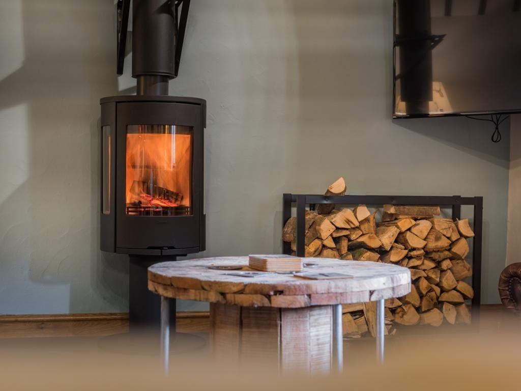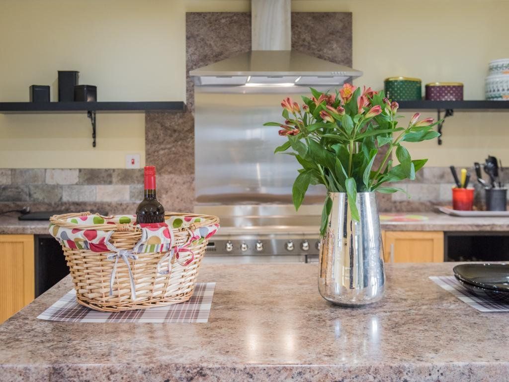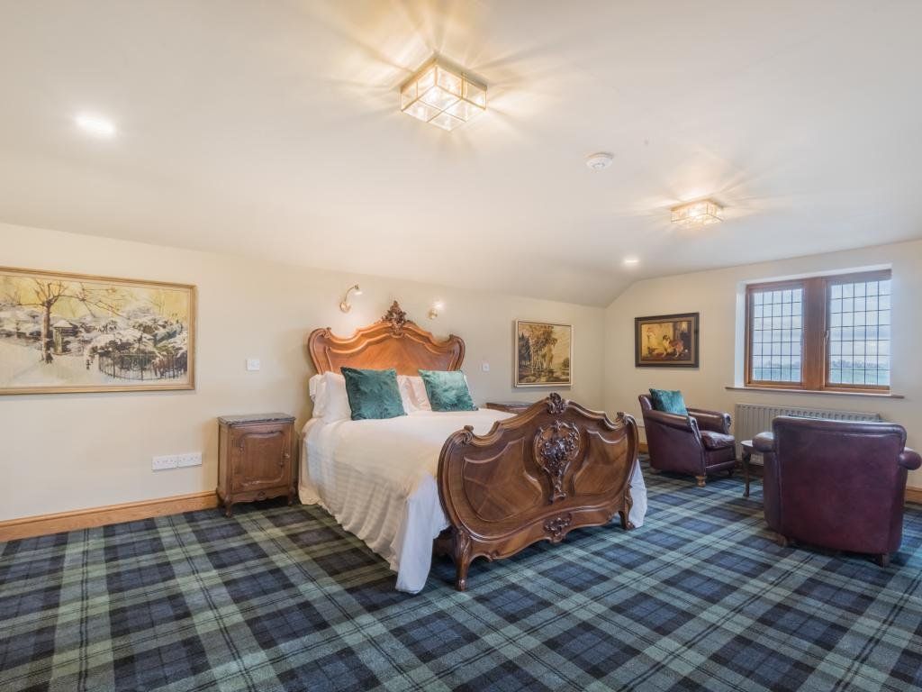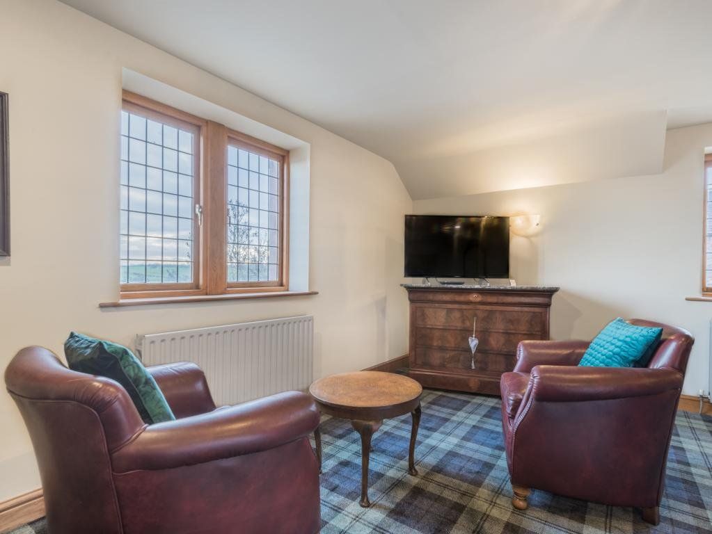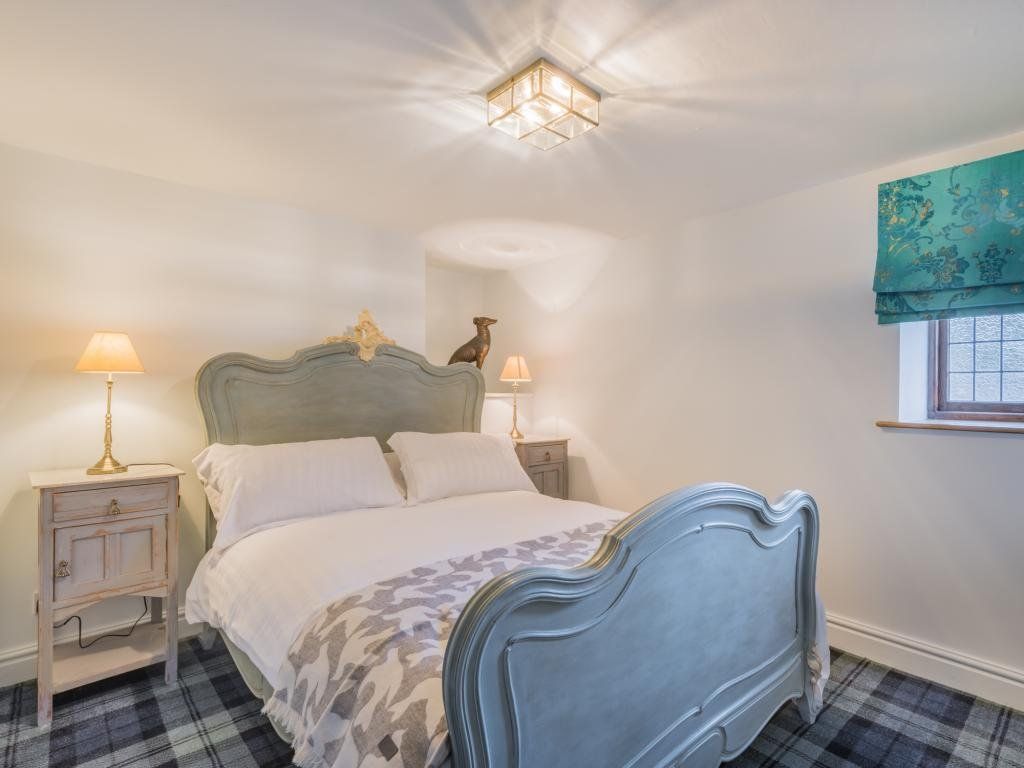The upstairs living room is a stunning vaulted space with exposed roof timbers and a large wood burner for cosy evenings lounging on the sofa round the fire. Traditionally furnished and perfectly finished with paintings and ornaments befitting the room, it has an effortlessly timeless style, inviting you to sit down and make yourself at home.