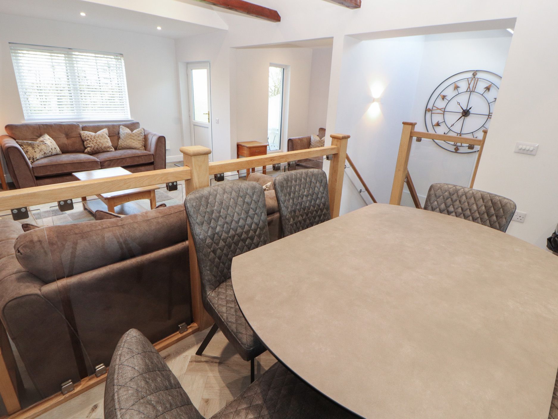 Accomodation Details Reverse-level. Three ground-floor bedrooms: 1 x king size with en-suite walk-in shower, basin, heated towel rail and WC, 1 x twin, 1 x bunk. First-floor bathroom with bath, shower over, basin, heated towel rail and WC. First-floor open-plan living space with kitchen, Gas oven and hob, microwave, fridge/freezer, dishwasher. dining area and sitting area