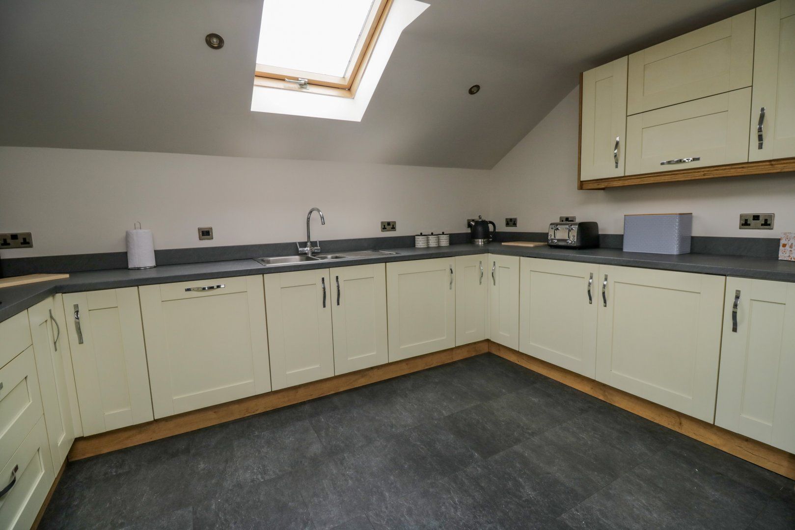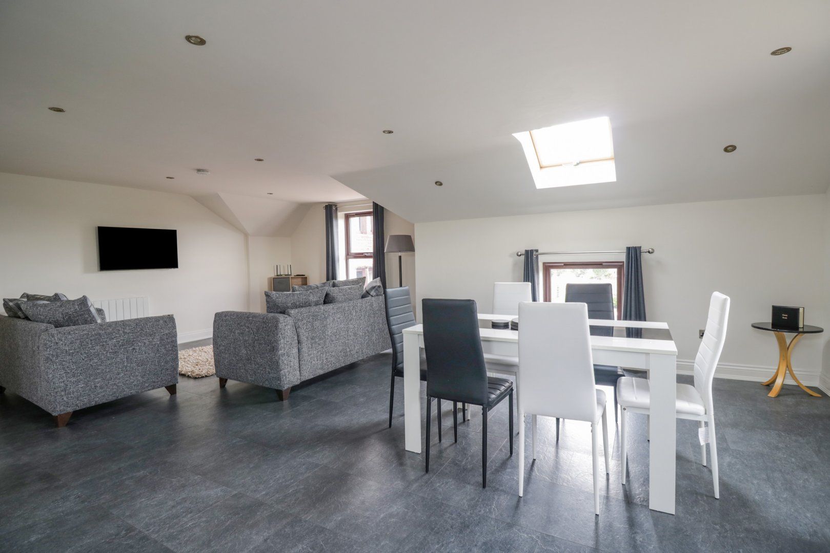 Set over first-floor. Two bedrooms: 1 x super-king double (zip/link, can be twin on request) with en-suite walk-in shower, basin and WC, 1 x super-king double (zip/link, can be twin on request) with Jack-and Jill access to bathroom. Bathroom with bath, walk-in shower, basin and WC. Open-plan living space with kitchen, dining area and sitting area. Ground-floor games room