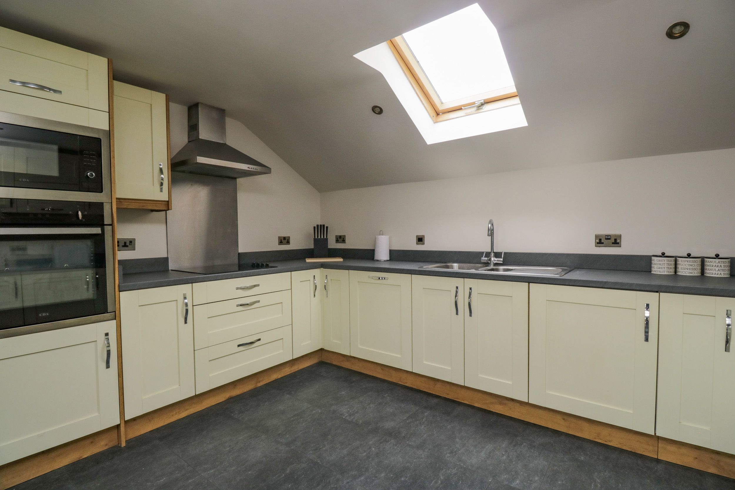 Electric central heating. Electric oven, hob, microwave, fridge/freezer, washer/dryer and dishwasher. TV, WiFi, pool table, arcade games. Fuel and power inc. in rent. Bed linen and towels inc. in rent. Off-road parking. Front garden with lawned area and patio. One well-behaved dog is welcome. Sorry, no smoking. Shop 0.4 miles, pub 0.8 miles. Note: Access is gained by a flight of side steps. Note: There are warehouses nearby; however, views overlook these. Note: Dogs to be kept on lead on the grounds please. Secure storage for bicycles available