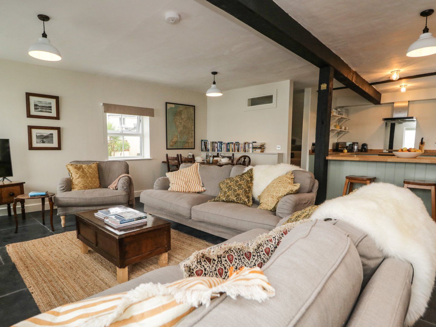 Accomodation Details Three bedrooms: 1 x king-size with en-suite walk-in shower, basin, heated towel rail and WC, 1 x small double, 1 x ground-floor twin. Upstairs bathroom with bath, shower over, basin, heated towel rail and WC. Open-plan living space with kitchen, dining area and sitting area with woodburning stove