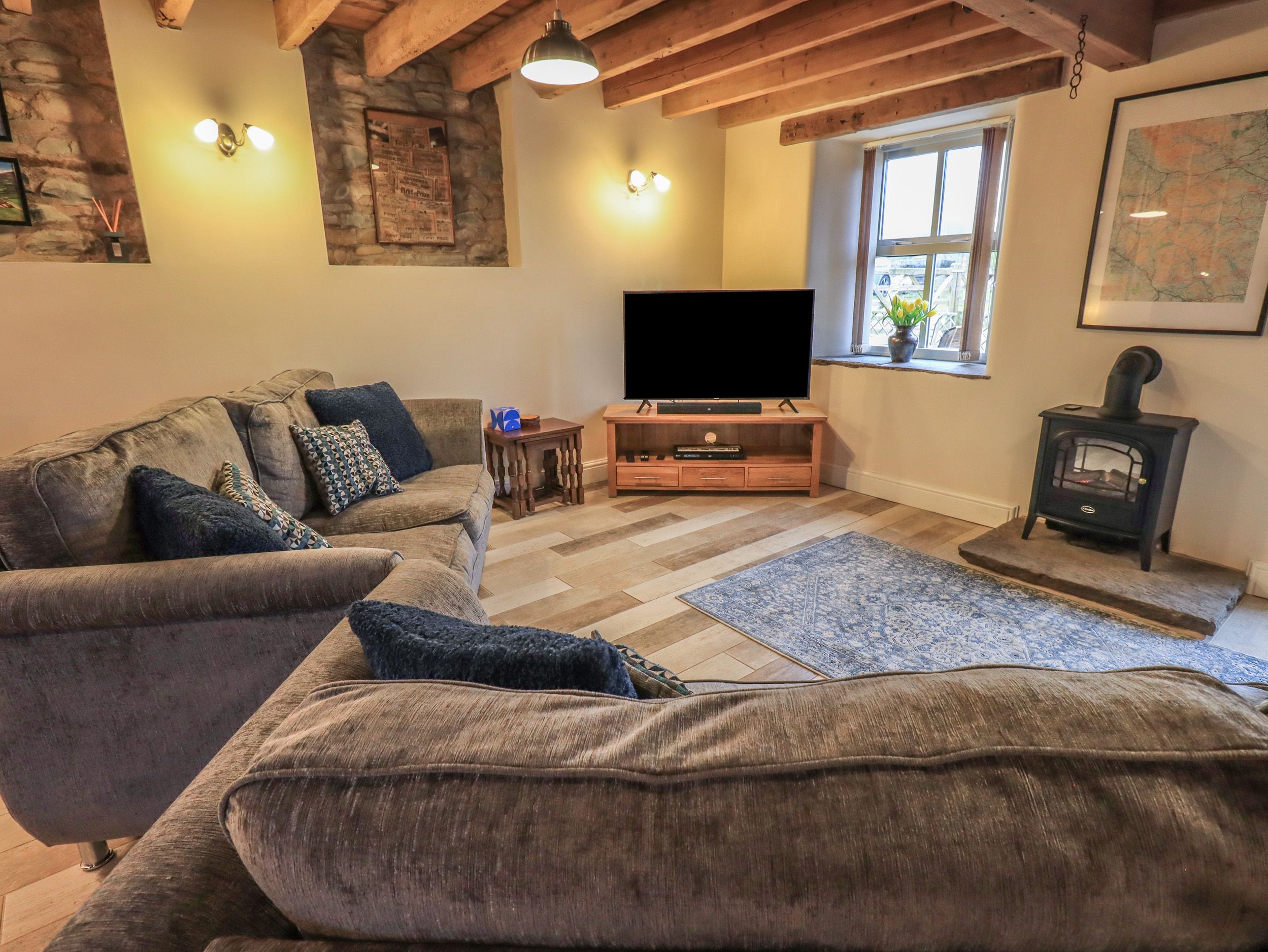 Boskins is a barn conversion placed in the market town of Sedbergh in Cumbria. It offers two bedrooms, both with en-suites, they are made up of a super king-size and a twin zip/link, the property is able to sleep four people. Its interior also includes a kitchen and a living/dining room. The exterior of the cottage provides off-road parking for three cars, as well as a patio with furniture. Boskins is a homely, charming cottage perfect for friends, couples or family looking to explore this magnificent rural region of England.