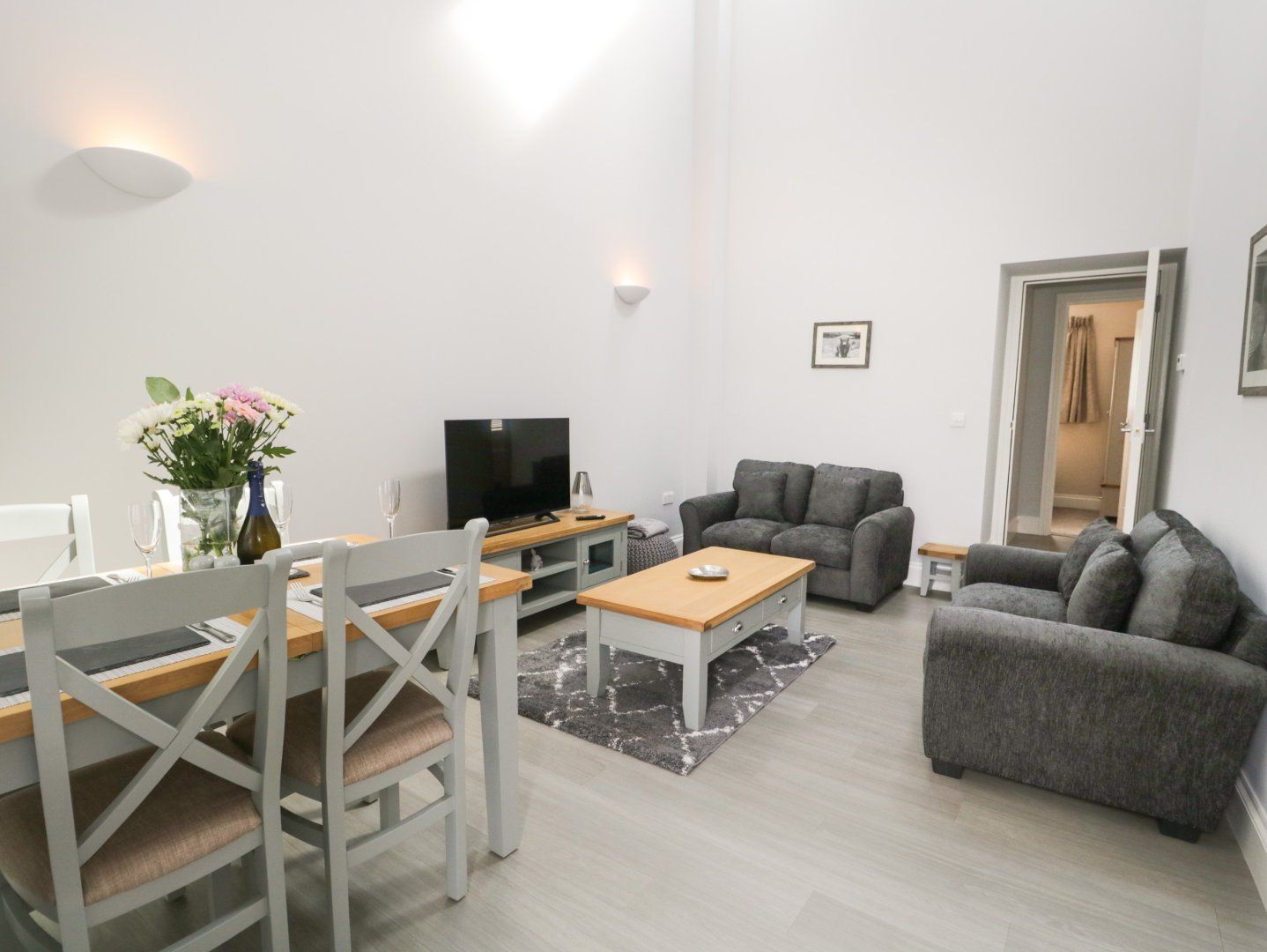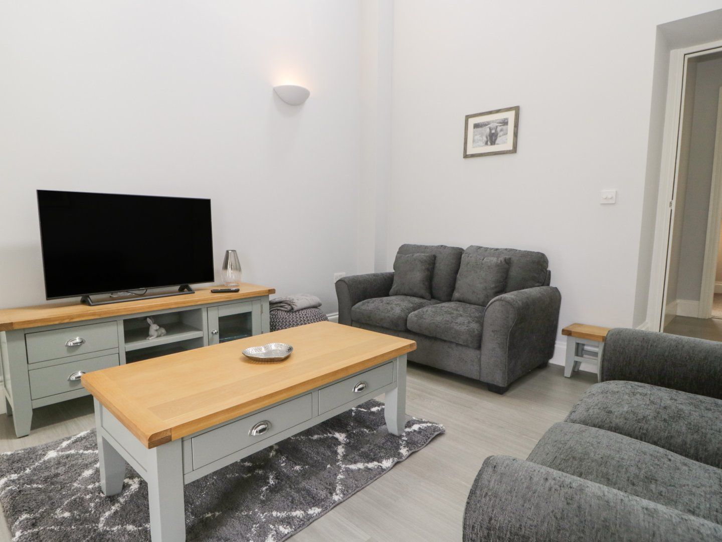 Oil central heating with electric underfloor heating. Electric oven and hob, microwave, fridge/freezer, washer/dyer, dishwasher. Smart TV, WiFi. Fuel and power inc. in rent. Highchair and travel cot available on request. Off-road parking for 1 car. 2 x electric charging point, to be shared between 3 properties. Front shared garden with lawn, patio and furniture. Sorry, no pets and no smoking. Shop 3.3 miles, pub 0.1 miles. Note: Property is on a working farm