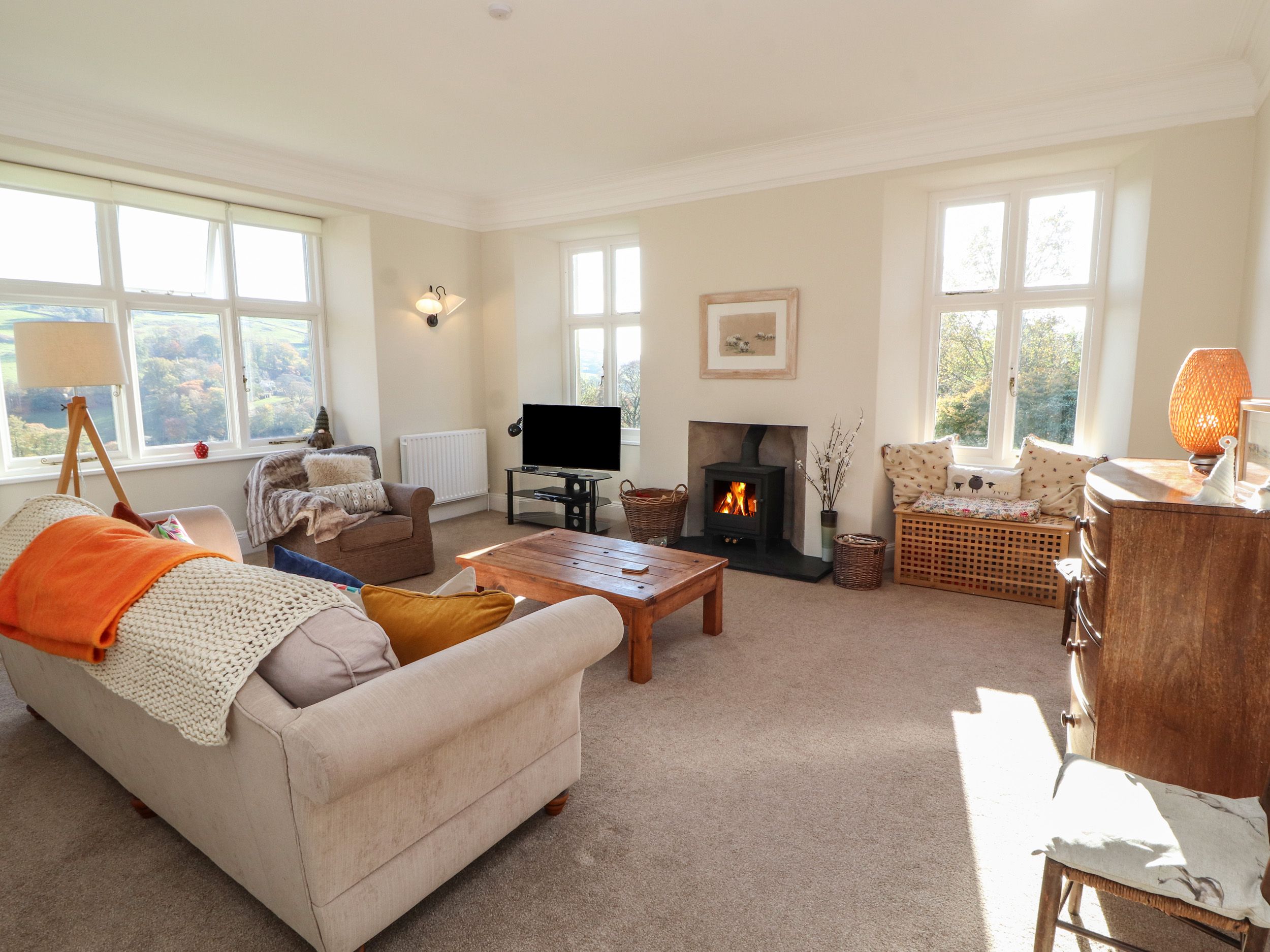 Accomodation Details First-floor apartment. Three bedrooms: 1 x super-king-size (zip/link, can be twin on request), 1 x king-size, 1 x double. Bathroom with bath, shower over, basin, heated towel rail, and WC. Shower room with walk-in shower, basin, heated towel rail, and WC. Kitchen/diner. Utility. Sitting room with woodburning stove. Snug