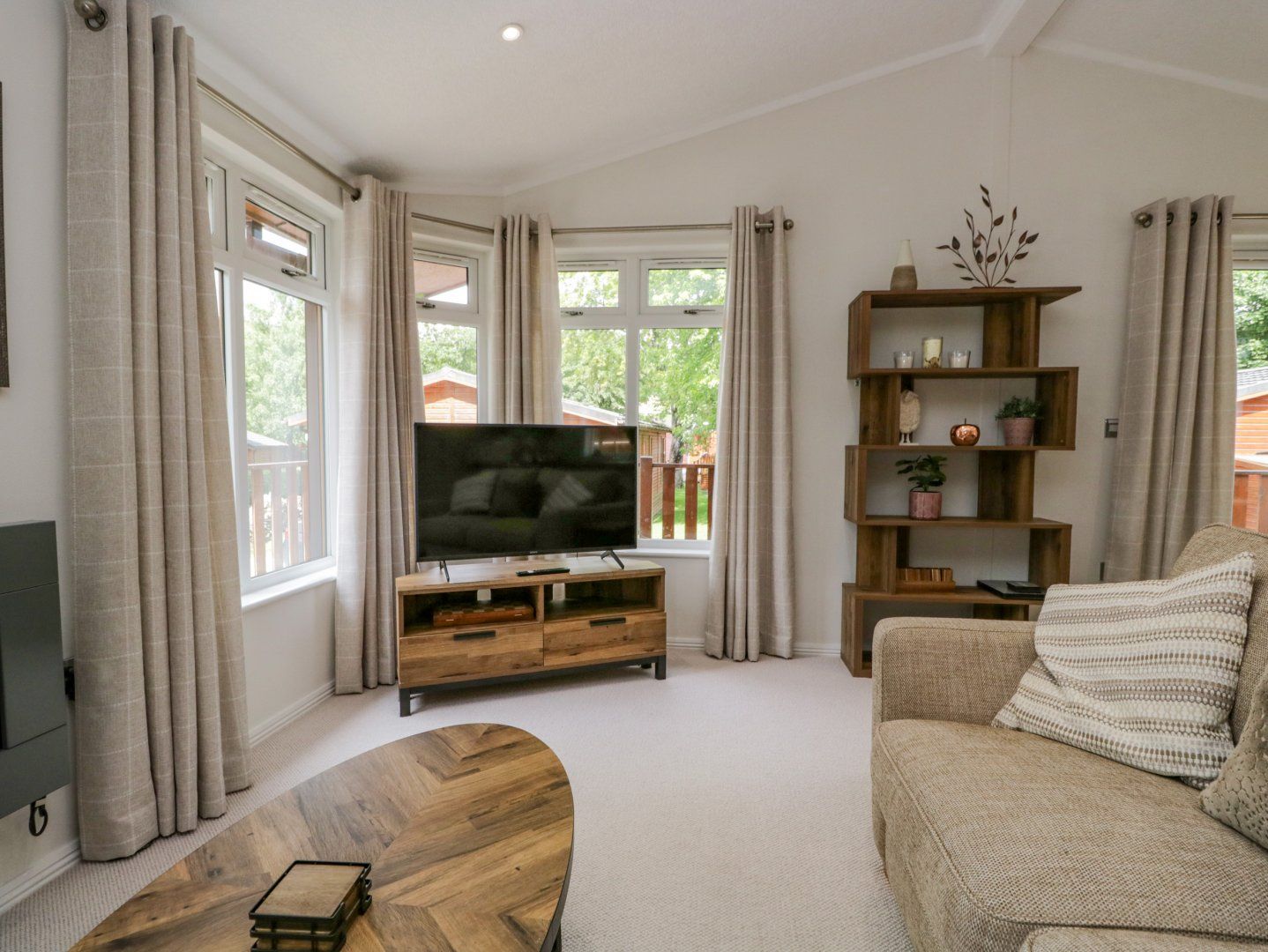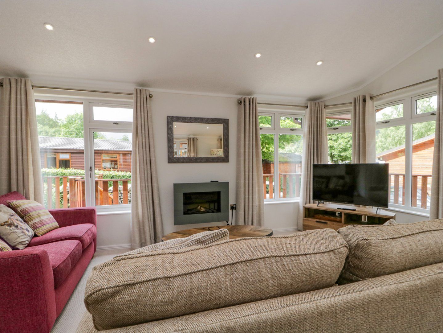 Accomodation Details Single-storey. Two bedrooms: 1 x double with TV and en-suite walk-in shower, basin, heated towel rail and WC, 1 x twin with TV. Bathroom with corner bath, basin and WC. Open-plan living space with newly refurbished kitchen, dining and sitting area with electric fire