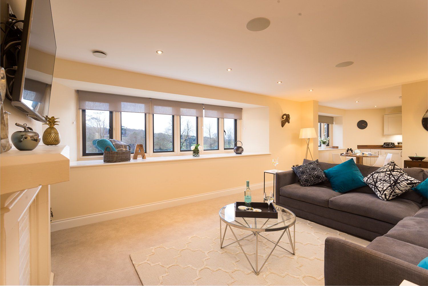 Accomodation Details Highly Commended for a four star property. Sophisticated, first floor apartment in a stunning Lakeland residence. Sleeps 4, 2 Spacious bedrooms, 1 King Size, 1 Superking or twin, Luxury en-suite shower room, Luxury family bathroom, Spacious open plan living with Delightful views of the grounds and fell views towards Langdale and Loughrigg. Access to beautiful communal grounds, One private parking space and visitor spaces. 1 well behaved dog welcome. Babies & children welcome. Secure covered bike store
