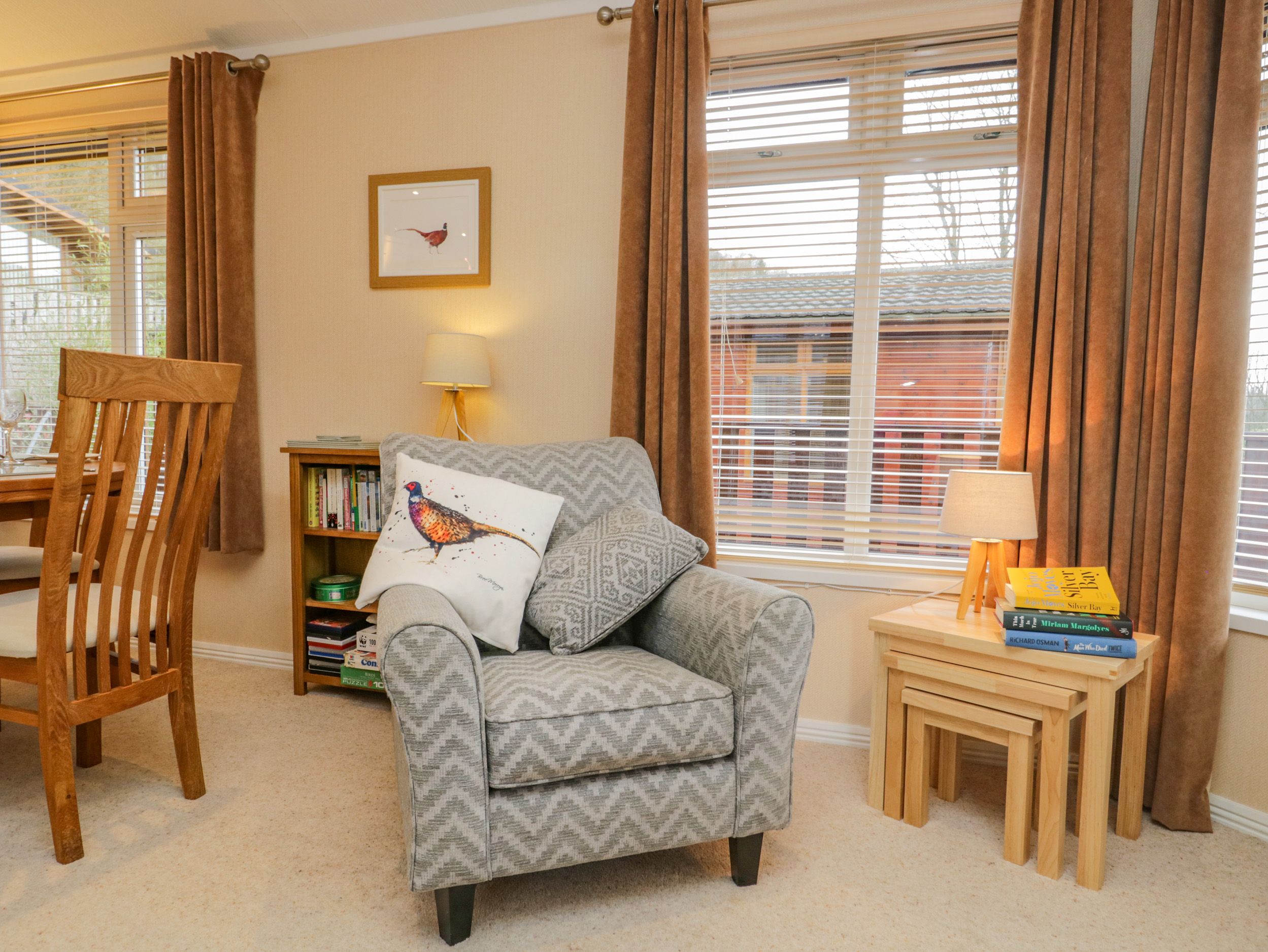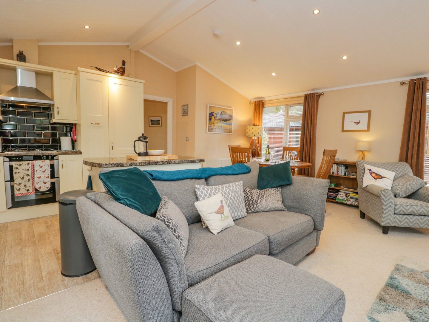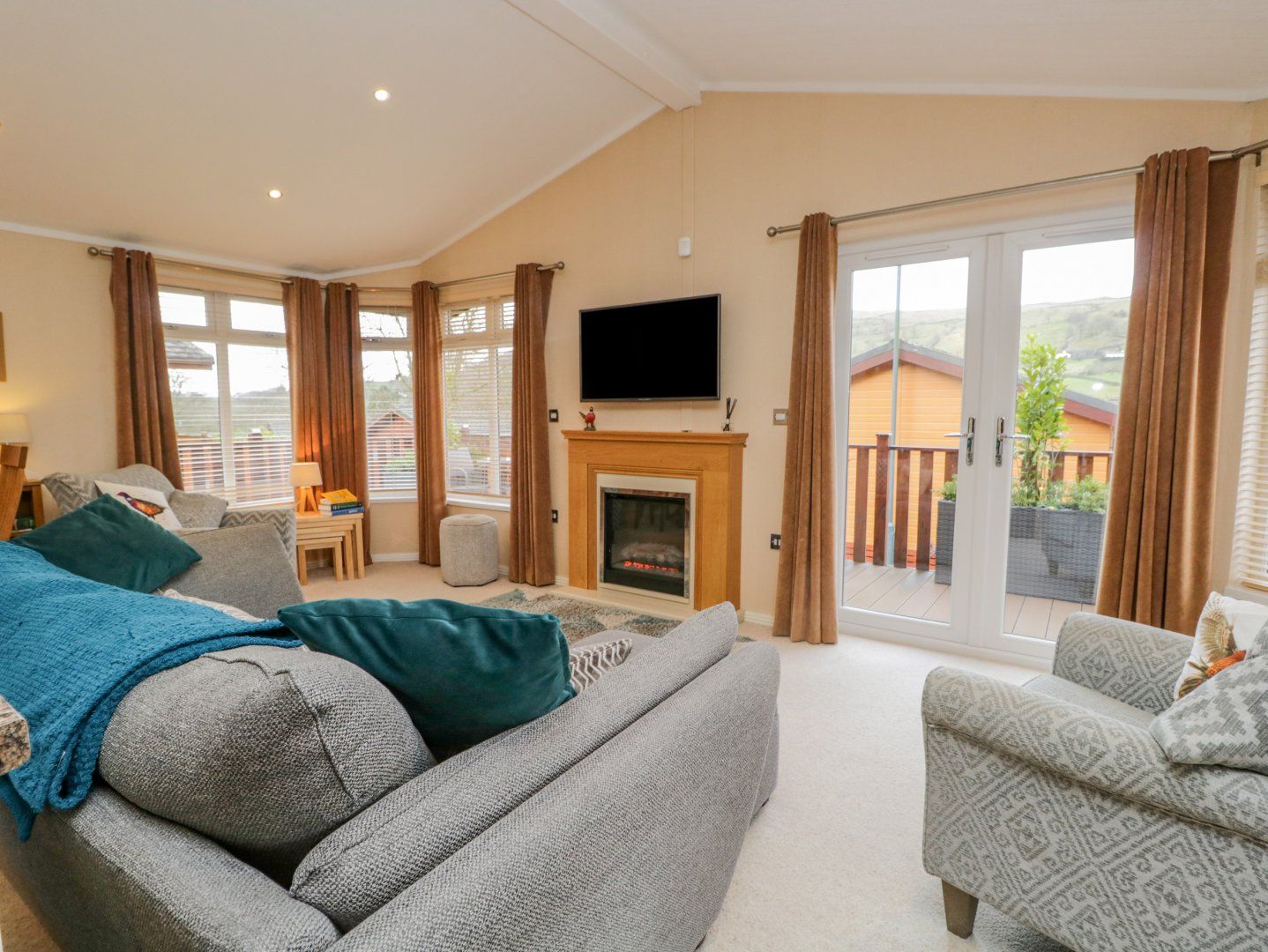 Accomodation Details All-ground-floor. Two bedrooms 1 x king with en-suite shower room, 1 x twin. Family shower room with double width walk-in shower, basin and WC. Open-plan living area with feature fire place, 1 x sofa and 2 x arm chairs, kitchen with gas oven and hob. Decking with outdoor furniture.