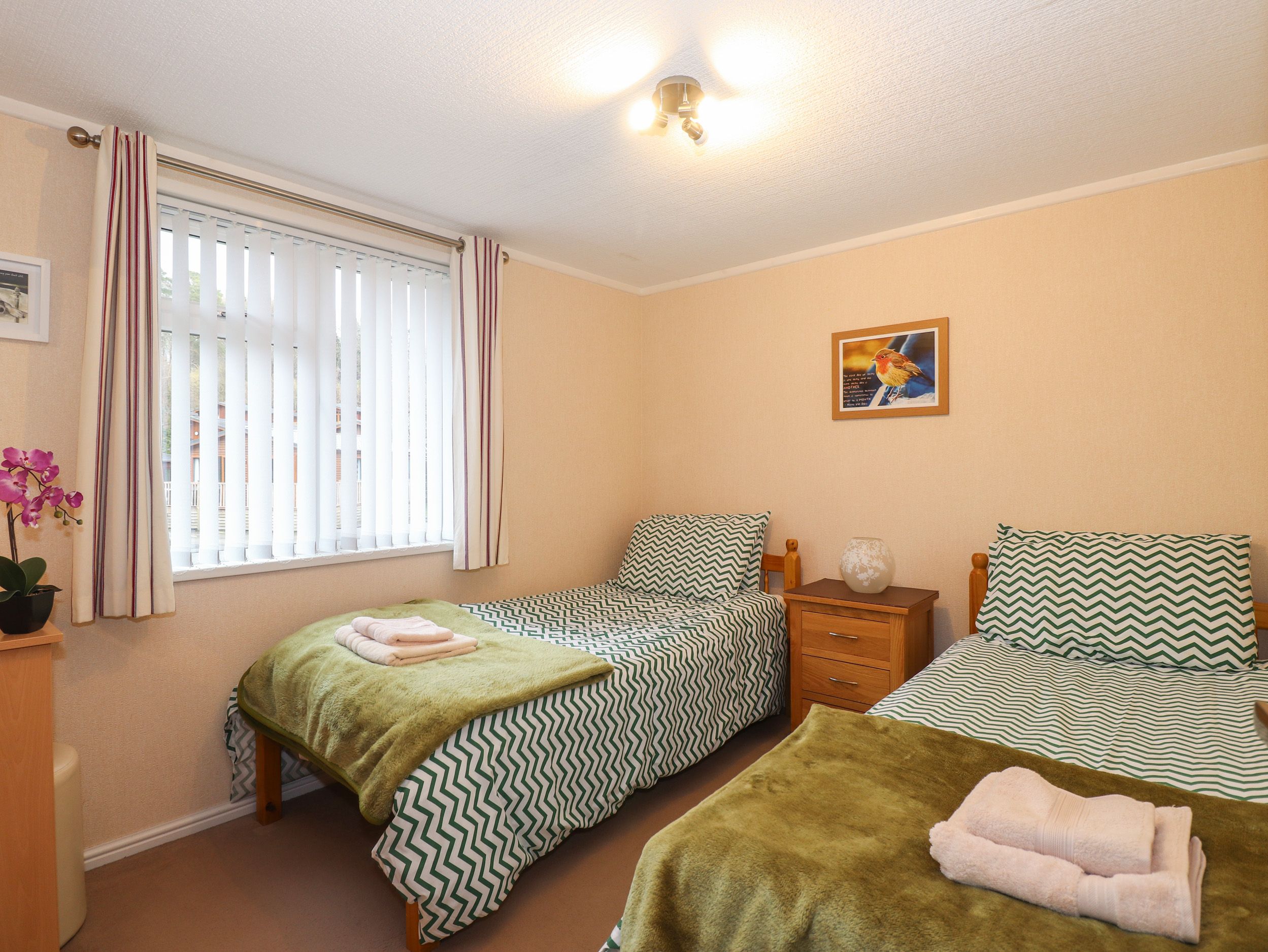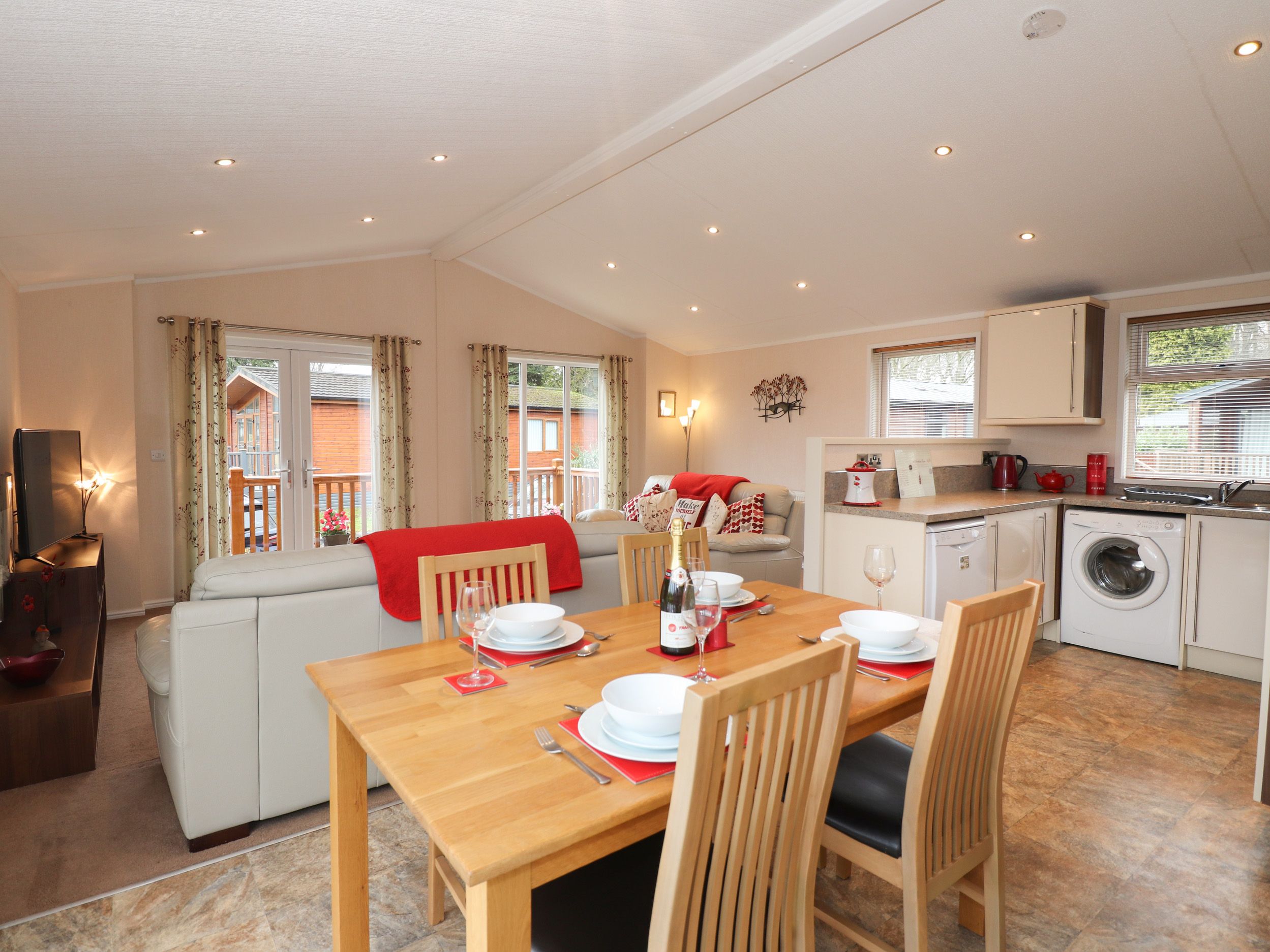All-ground-floor. Two bedrooms 1 x Double with en-suite shower room, 1 x twin. Family bathroom with over bath shower and screen, hand basin and toilet. Open-plan living area with electric fire. The owners of this lodge offer a 5% discount to returning guests. This property doesn't accept children under the age of 4. Pease note - check in is 3pm and check out is 10am.