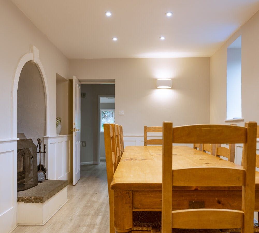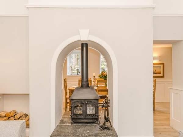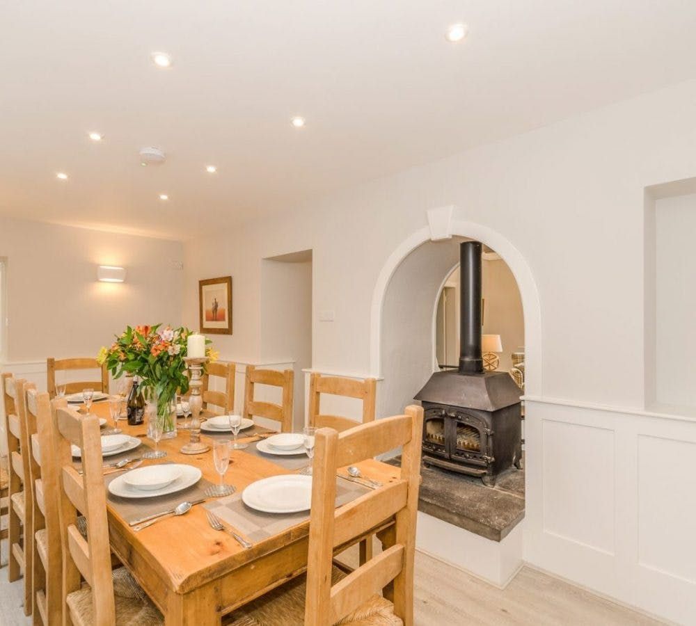 Inside, the design could definitely be described as minimalist, with walls painted in soothing whites adorned only by a few well-chosen pieces of artwork, a sleek kitchen and a preference for simple wooden furnishings. The wood-burning fireplace situated in an archway between the living room and dining area is sure to keep the whole ground floor warm and toasty.