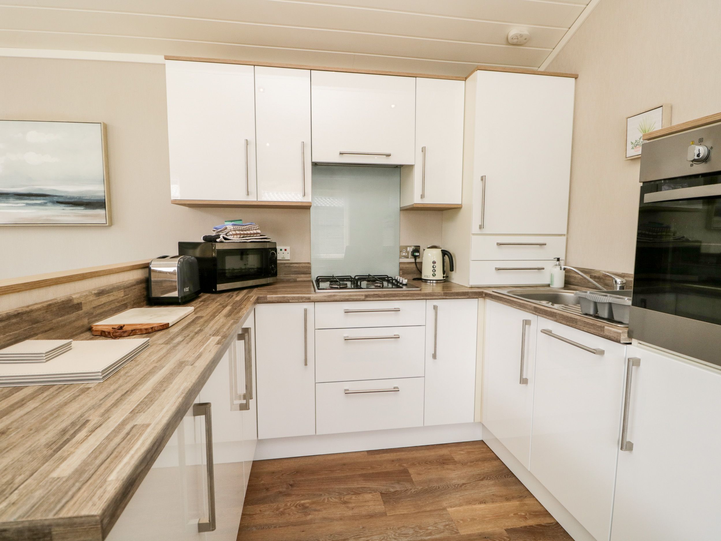 All-ground-floor. Two bedrooms: 1 x King Size en-suite with shower, sink, toilet and heated towel rail/radiator, 1 x twin with fitted wardrobe and bedside cabinet. Housebathroom with bath with over bath shower, toilet, sink, mirrored vanity unit heated chrome towel rail/radiator Open-plan living space with kitchen, dining area and sitting area plus a 2 and 3 seater leather sofa with footstool, wall mounted flat screen Smart TV with HDMI & USB ports, DVD player, high gloss white fitted kitchen.