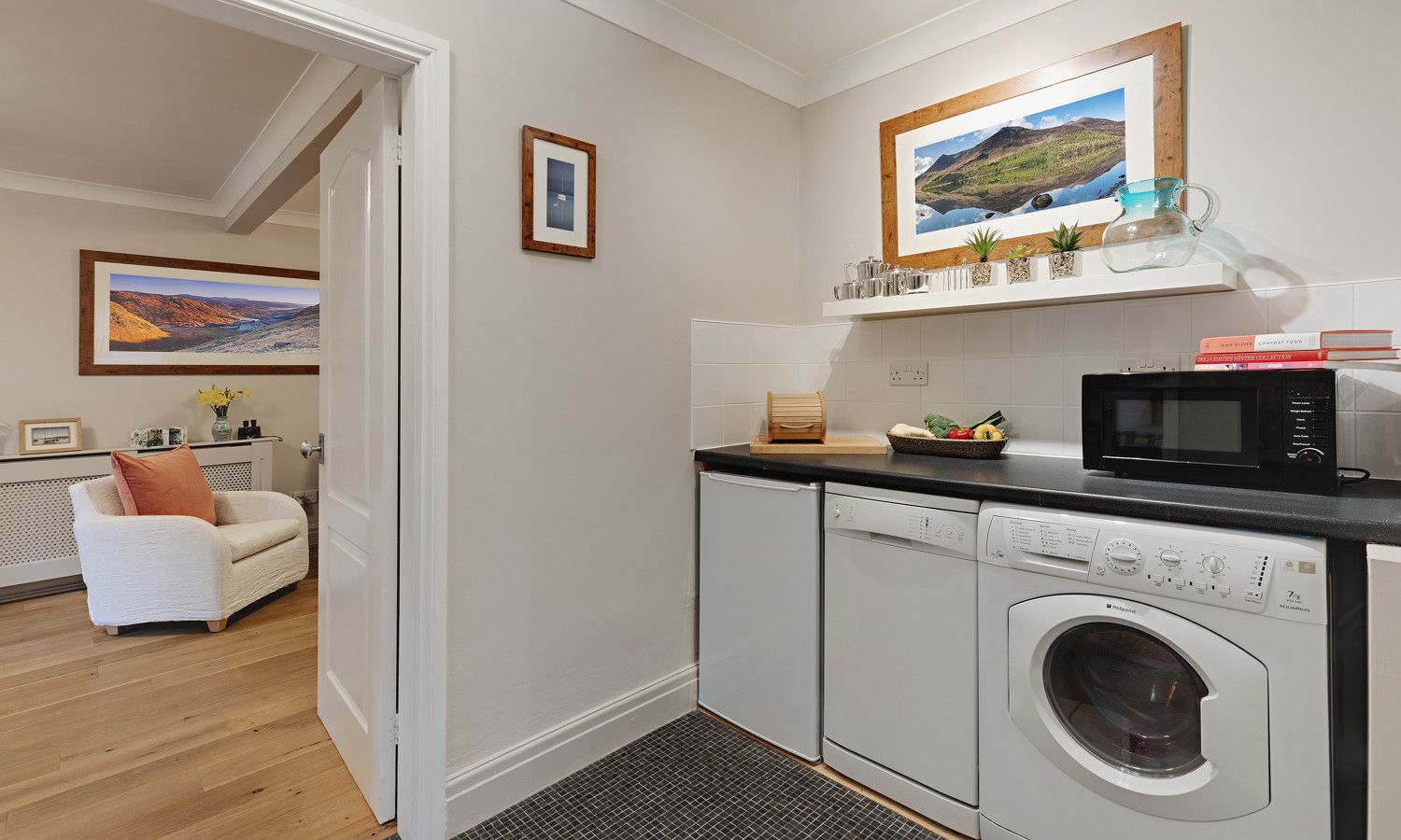 Central village setting. Gas central heating. Wood Burning stove, Slate ensuite power shower room, Second bathroom with power shower over bath. 2 WCs. Electric oven & induction hob. Dishwasher. Fridge. Washer/dryer. Smart TV Wi-Fi. Patio garden with garden furniture. 1 minutes walk to the village centre. Private parking. Secure bike store. Ample space for boat / canoe private storage. Bed linen and towels provided. Sorry - Property not suitable for Infants or Children.