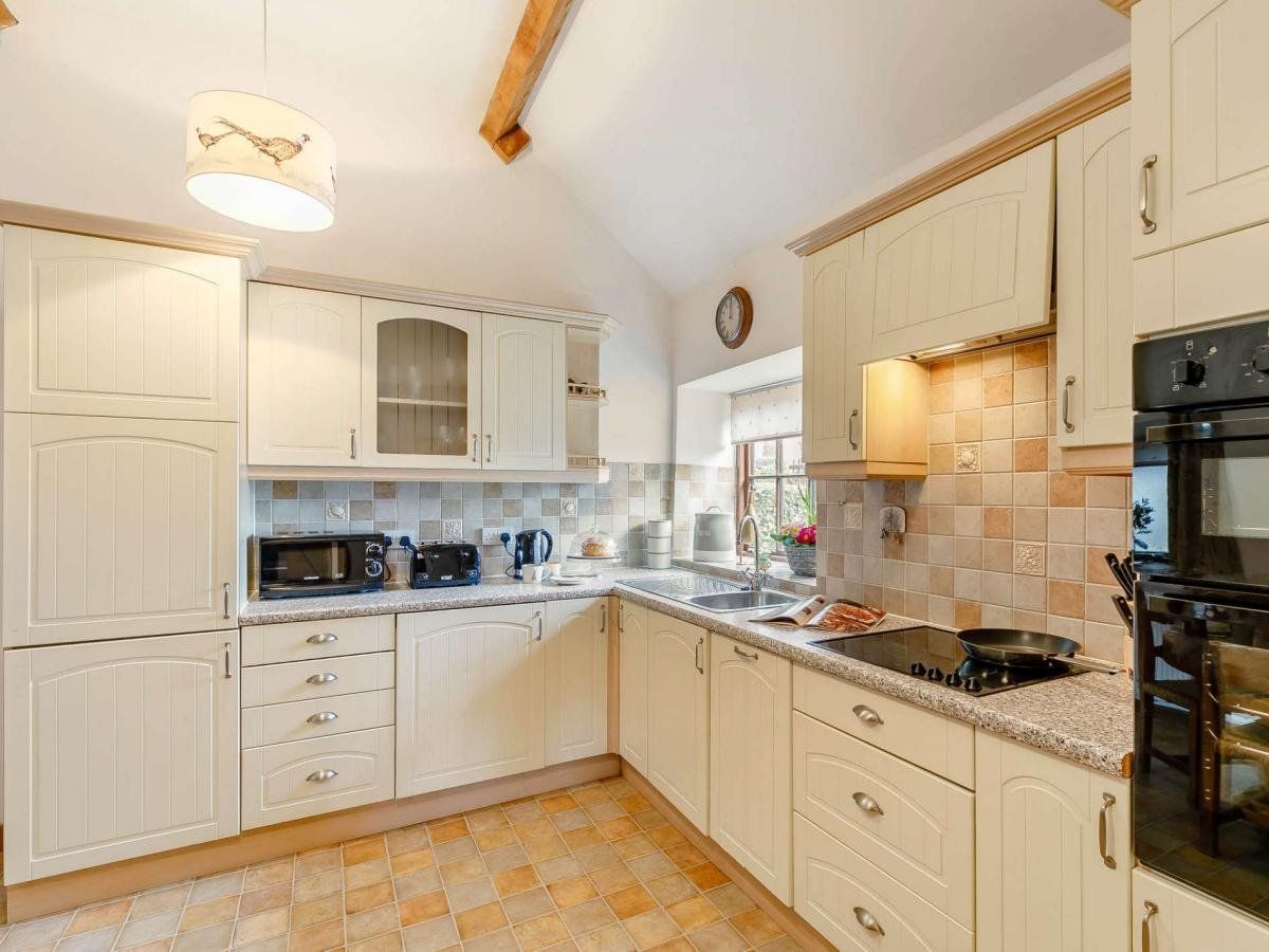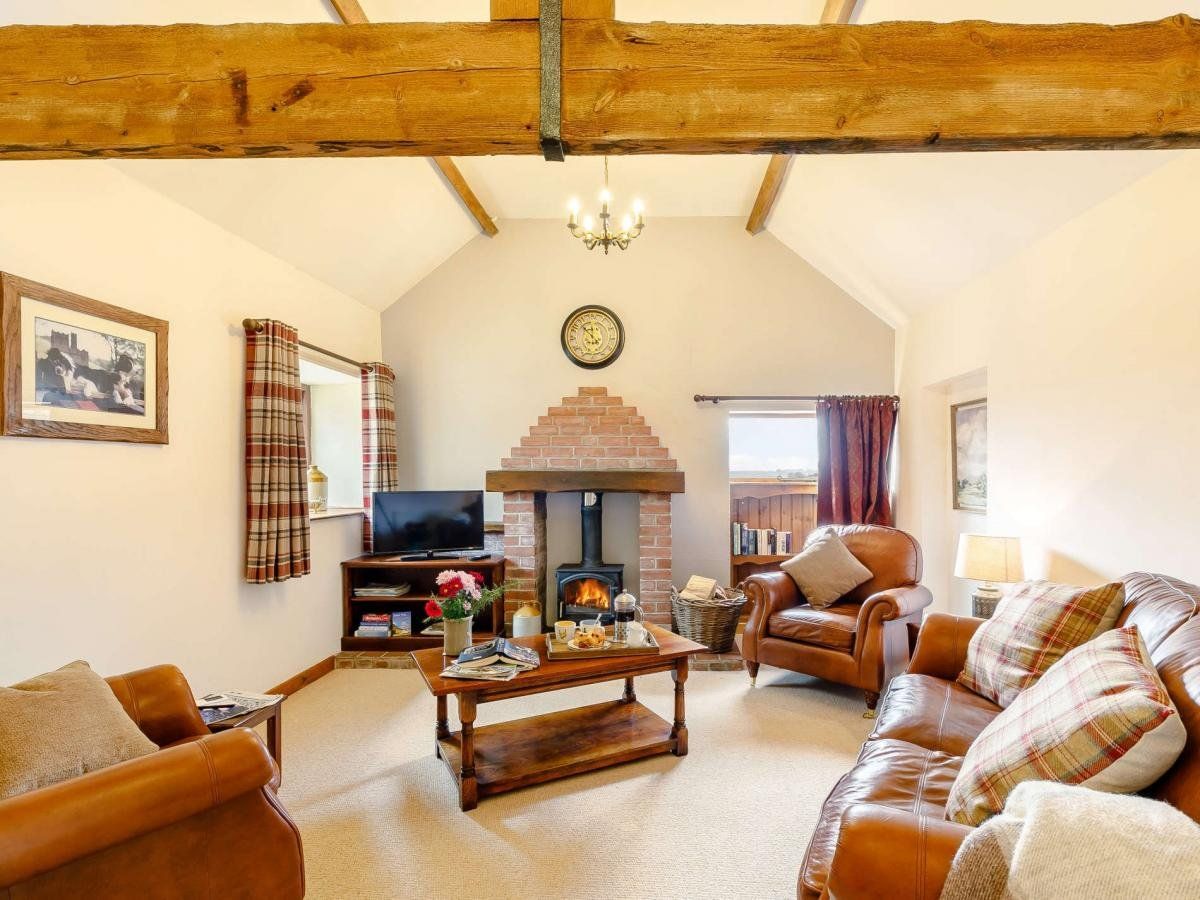 This charming property boasts an inviting country interior with warm wood and leather accents, a brickwork fireplace, and exposed ceiling beams.