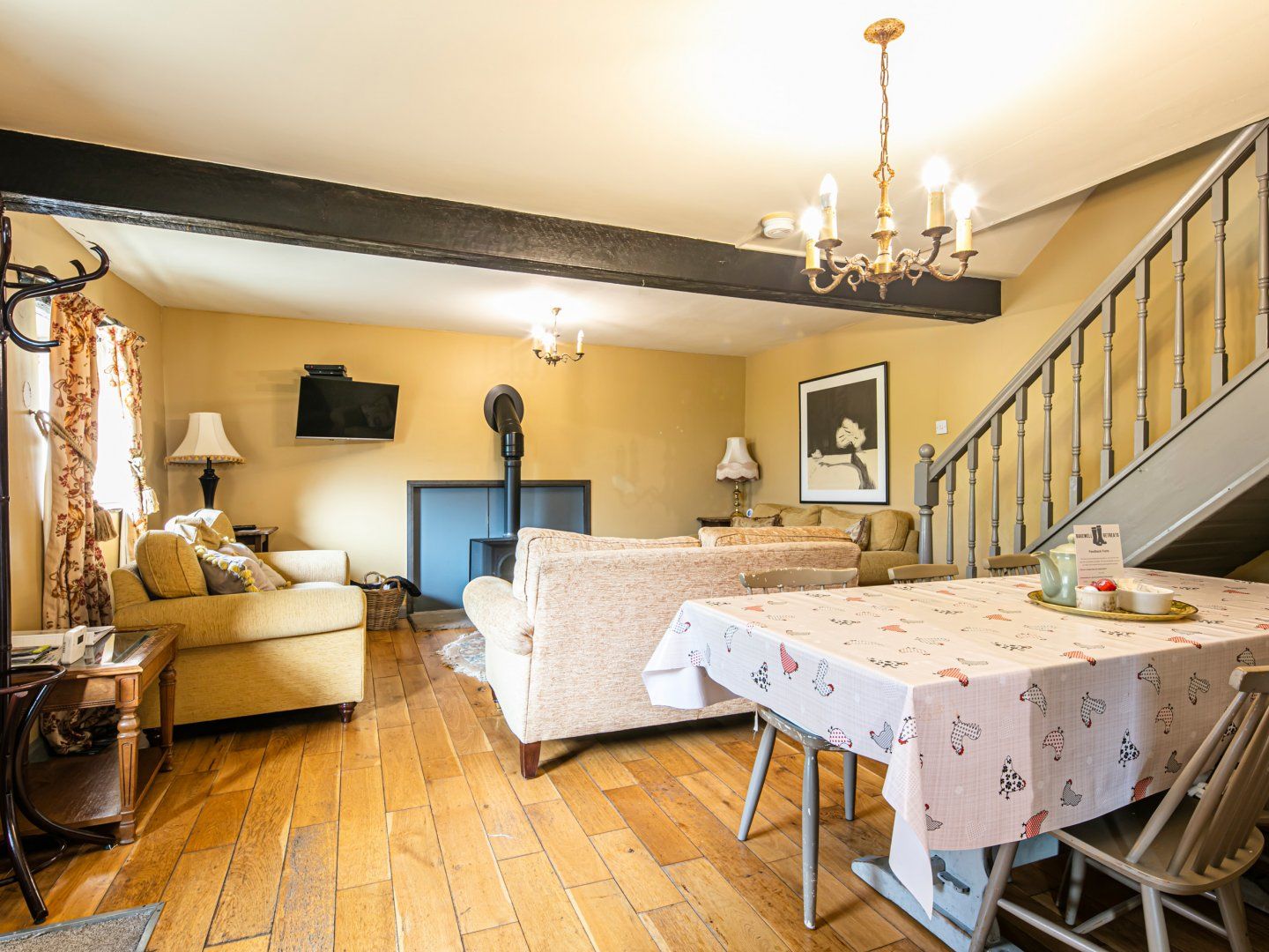 Amenities Central heating. Electric double oven, induction hob, microwave, fridge/freezer, dishwasher. TV with Freeview, DVD, WiFi, pool table, table tennis. Fuel and power inc. in rent. Bed linen and towels inc. in rent. Travel cot, highchair and stairgate available on request. Private parking for 2 cars. Private front patio with furniture and barbecue. Two well-behaved pets welcome. Sorry, no smoking. Shop 3.5 miles, pub 2.2 miles. Note: Guests also have access to a shared indoor heated swimming pool, an open field with football nets/badminton, boot room and secure storage in the bike shed. Note: This property can also accommodate stag and hen dos, as well as weddings. Note: Towels for swimming pool not provided, guests are encouraged to bring their own. Logs for the fire can be provided by the owners at an extra cost.