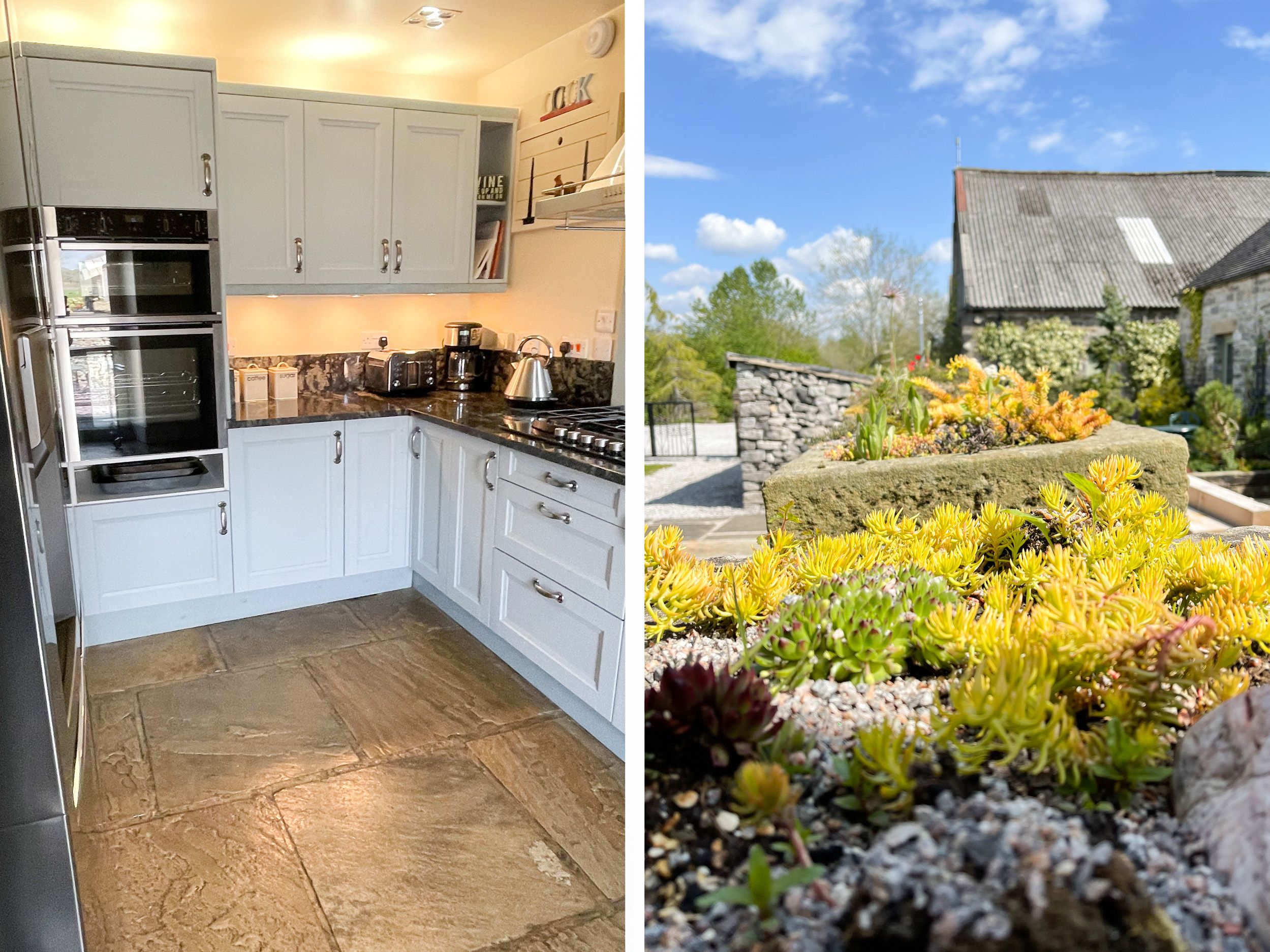 Stayed for a week with our 2 daughters and their families. Including 1 year old toddler & 6 month baby. Plus 2 dogs. Barn looks a bit different from photos - corner of dining area where 'front' door was, is now a handy bathroom with laundry area off it. On arriving its not obvious where the main (back) door is. Big sign on the wooden gate would help. The house is beautifully furnished with lovely big bedrooms. 2 upstairs and 2 downstairs. All with ensuites. Plenty space for us all. Great big dining table for family meals and a well equipped kitchen with breakfast bar where table used to be. Nice touch to find milk in the fridge & a home baked cake for us. Ideal huge fridge freezer and plenty cupboards for our food. It really is 5 star accommodation. Only negatives were 1. the broadband was non existent. None of us could get onto the internet on our phones, tablets or access it for Netflix. 2. the house has underfloor heating which when not working means a freezing house. And when it was working, was difficult to control room temp. 3. Kitchen needs a serious deepclean. Oven and fridge especially. There was black mould round ice/water outlet on fridge &drawers need cleaned. Found a cremated chip rammed into back of oven shelf so guessing it's a while since oven deep cleaned. 4. The bottom few stairs are a hazard to toddlers, with sharp stone edges. As is the fireplace. So wouldn't recommend for young children. Despite these issues we enjoyed our stay and think the house is lovely for a large group holiday. It was great for the dogs too, with enclosed garden.