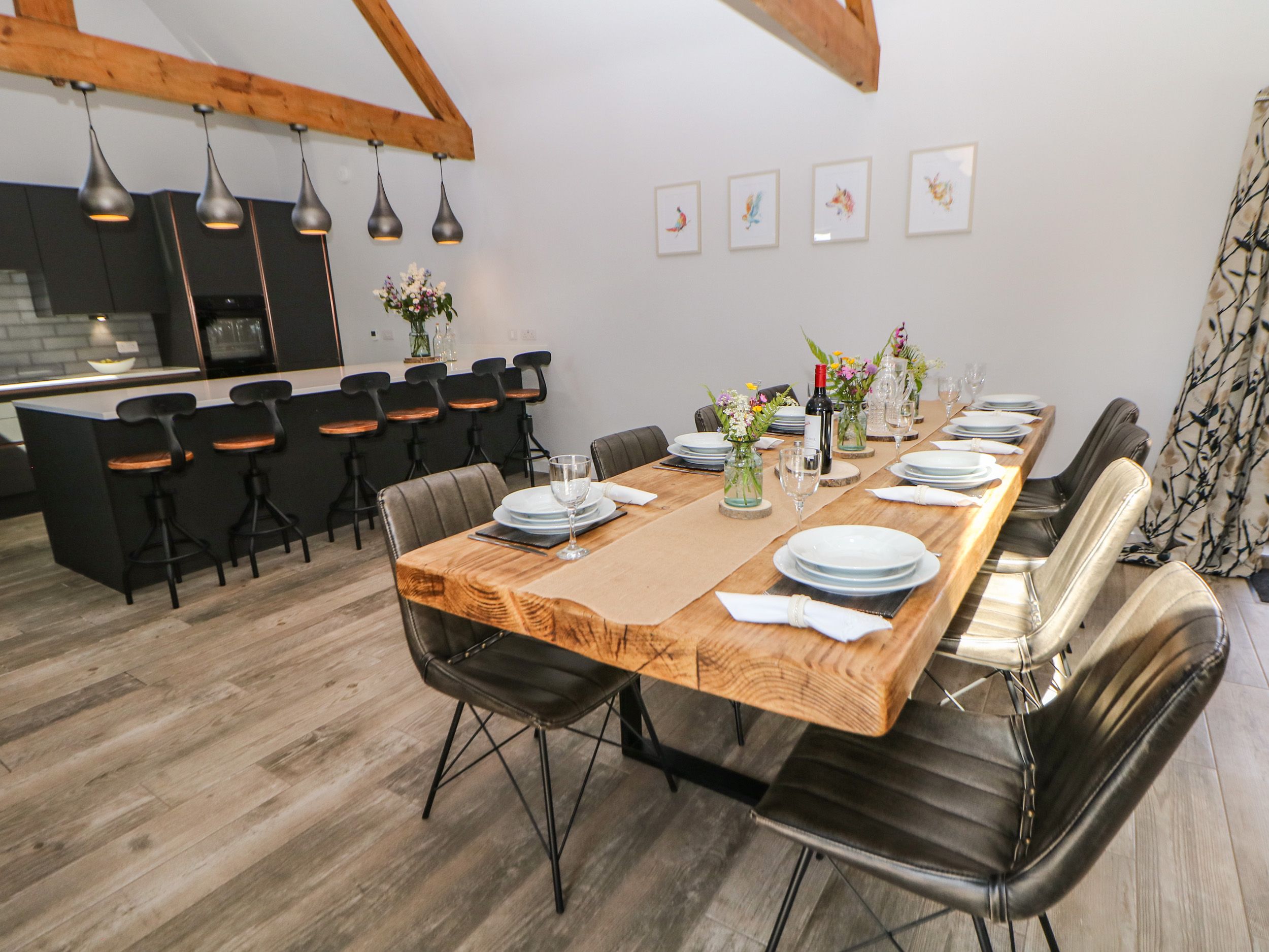 Holiday home The living areas in the property consist of an open-plan living space with kitchen equipped with two electric ovens and a hob, microwave, fridge/freezer, washing machine and dishwasher, a dining area with seating for eight guests and a sitting area with TV and LCD fire. The bedrooms consist of four bedrooms with en-suites: two ground-floor super-king-size (zip/link, can be twin on request) with TVs and two super-king-size (zip/link, can be twin on request), along with a cloakroom. Outside there is an enclosed garden with patio, furniture and hot tub, with shared access to lawn area, as well as off-road parking for eight cars. Within 3.9 miles you will find a shop and within 2.1 miles, a pub and please note that this is a pet-free, non-smoking holiday home. WiFi, fuel, power, bed linen and towels are all included in the price. A highchair and travel cot are also available on request. Langley Barn is a delightful escape for a family or group of friends in Derbyshire. Note: No Hen/Stag or similar parties. This property requires a minimum stay of 3 nights for bookings between 22/08/2026 and 03/09/2026.