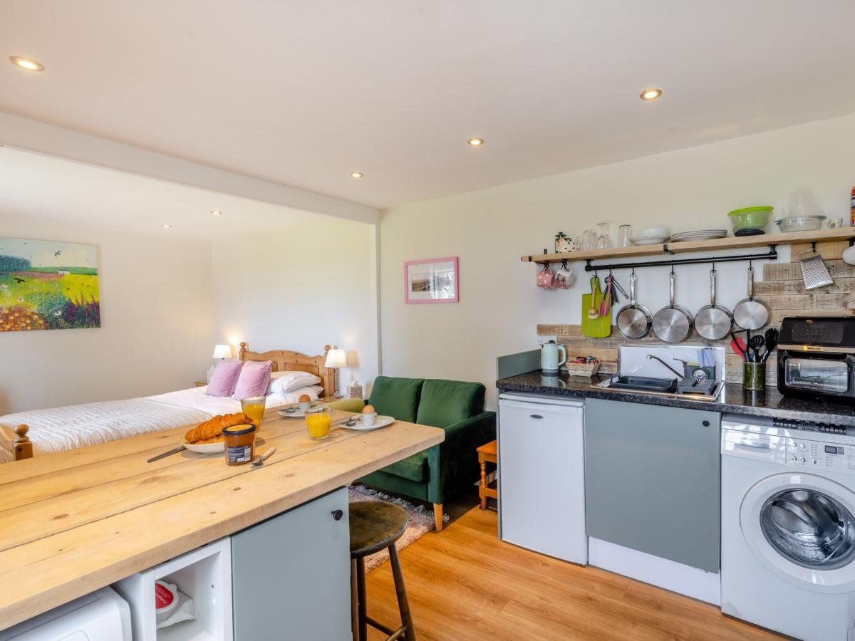 Step into the open-plan studio-style living area, where functionality meets comfort. The kitchen boasts a convenient breakfast bar, perfect for planning the day's adventures over a meal.