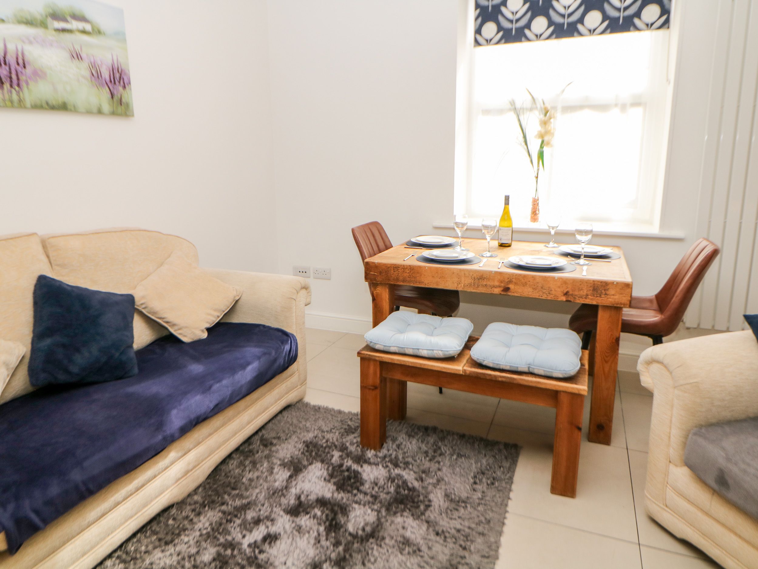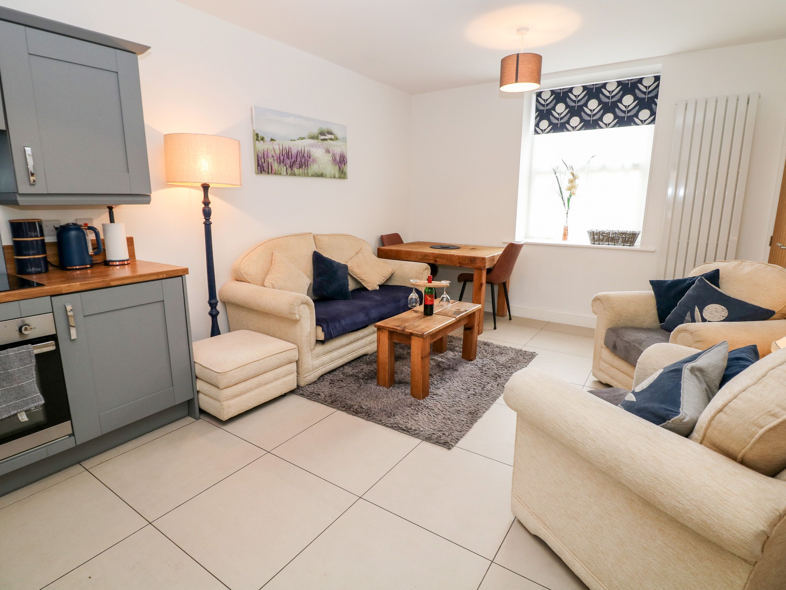 Two bedrooms with TVs: 1 x double, 1 x twin. Bathroom with bath, shower over, basin, heated towel rail and WC. Open-plan living space with kitchen, dining and sitting area