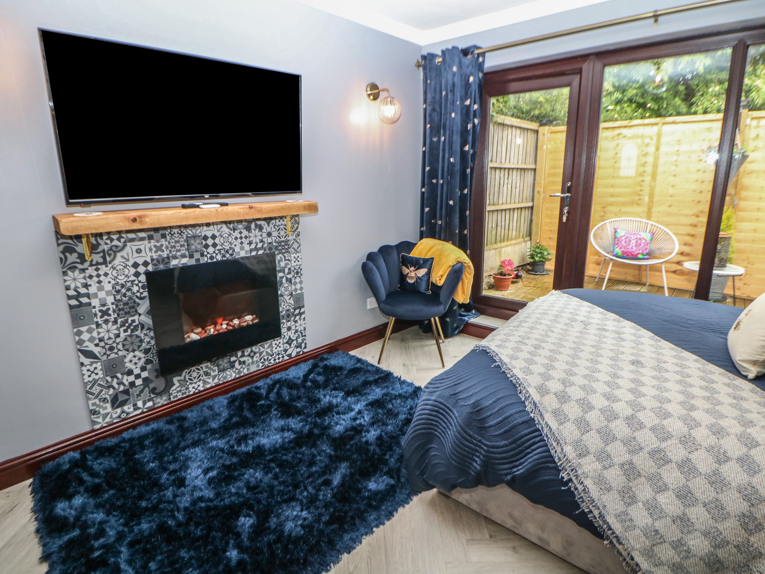 Single-storey. One double bedroom with Smart TV, flame-effect electric fire and en-suite walk-in shower, basin, heated towel rail, and WC. Open-plan living space with kitchen, dining area, and sitting area