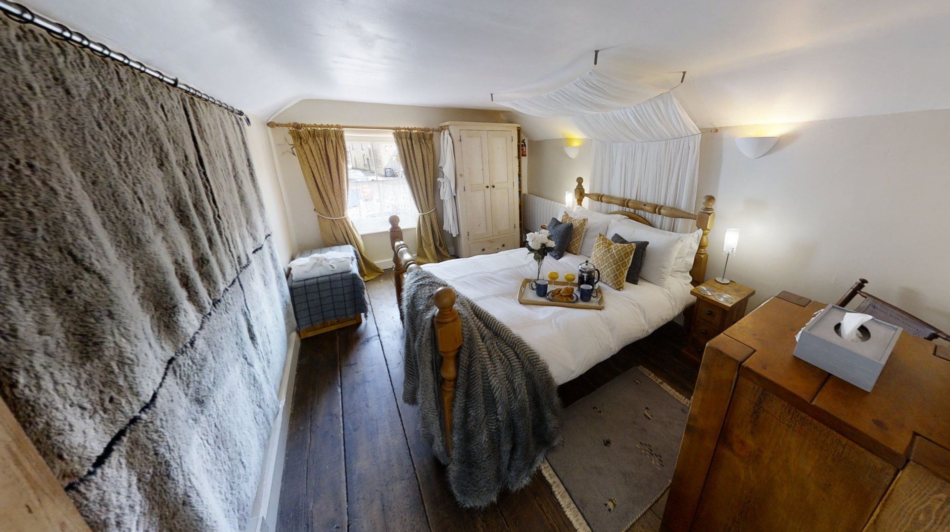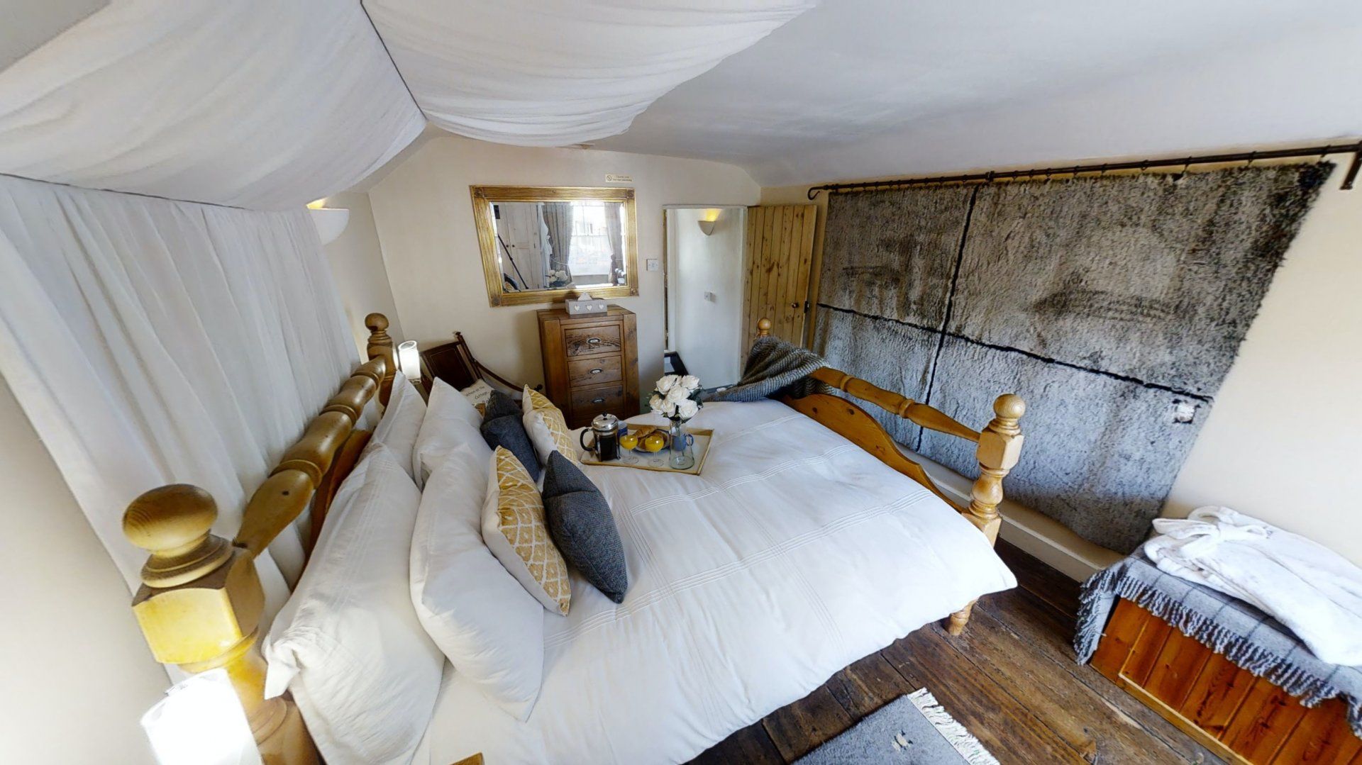 Climb the narrow stairs and you'll uncover a relaxing bedroom with a restful bed sitting beneath an elegant canopy, with a sleek bathroom just a step across the hallway.